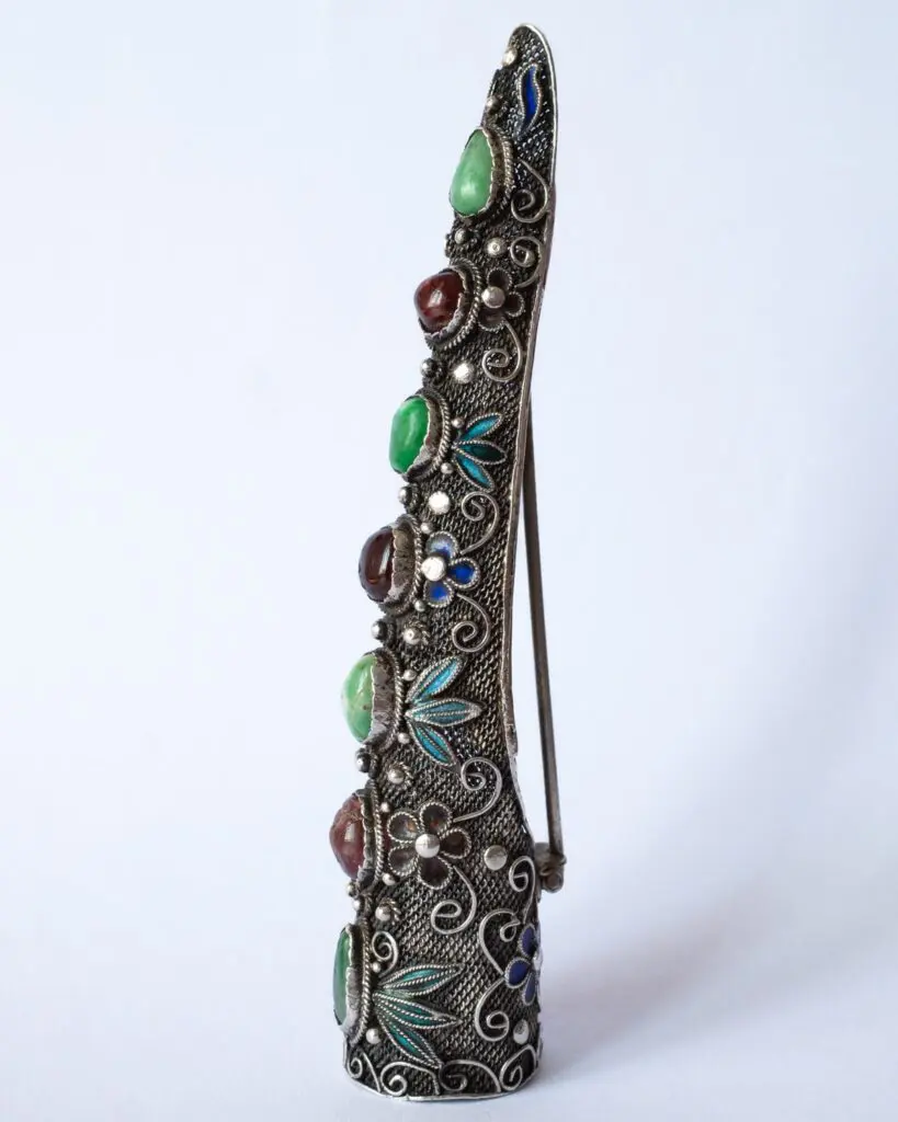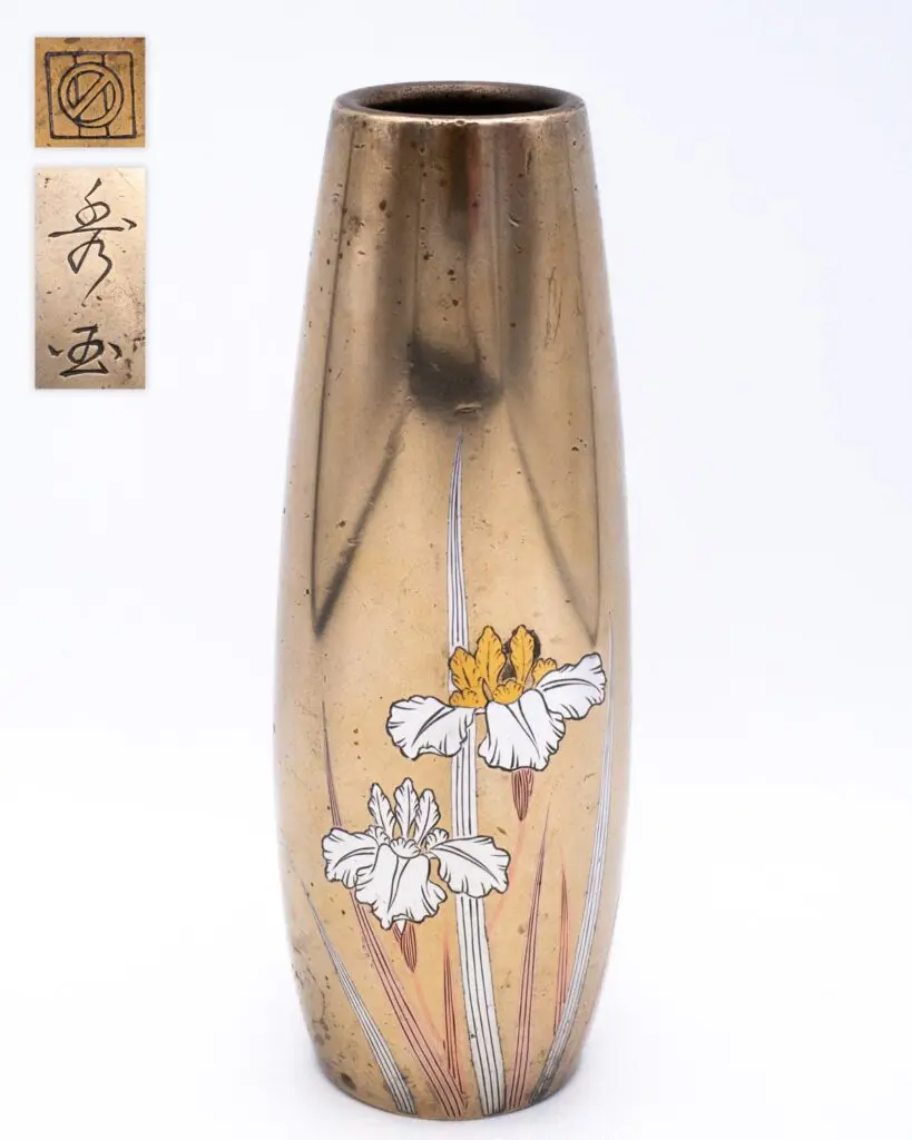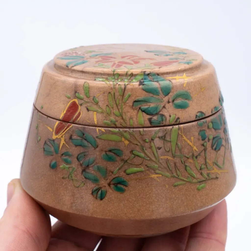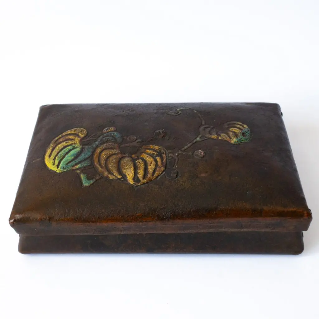 Rare early 20th century Japanese rustic ‘mingei’ copper accessory box with enamelled foliate decoration on the lid. Not marked but of the type that was produced by the Ando Jubei Closionne Company during the early 20th century. Interior lined with leather and paper. In good antique condition with typical age-related wear and patina as per photographs. Dimensions: 15×9.5×4 cm.