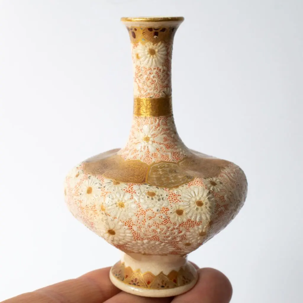Cute little Japanese ovoid Satsuma pottery vase with cartouches depicting figures, surrounded by floral sprays and geometric designs. Signed to the base but the mark is partially worn. Height: 9.5 cm.