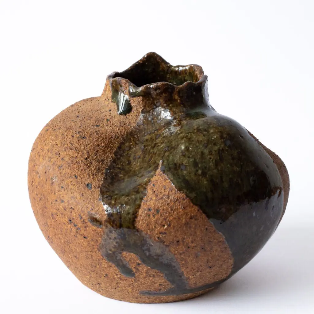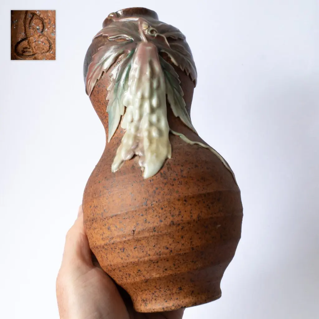 Rare antique Japanese Sumida Gawa pottery vase of a double gourd form, partially glazed at the top and embellished with a relief moulded bitter melon (Goya/Nigauri). Marked to the base with impressed 香二 (Koko) mark inside a double gourd. This is one of the maker’s marks of Ishiguro Koko 石黒香々. Really unusual example of this potter’s work. In great antique condition as photographed. Height: 21 cm.