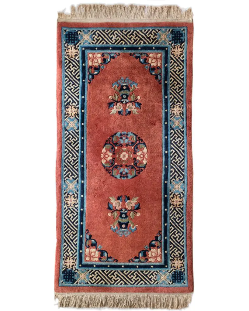Wonderful 20th century Chinese Peking wool rug with salmon background and indigo decoration featuring floral vases in the centre, framed by a fret border with medallions around the edge. Lovely rug with beautiful thick silky wool pile. Dimensions: 152×68 cm (including the fringe).