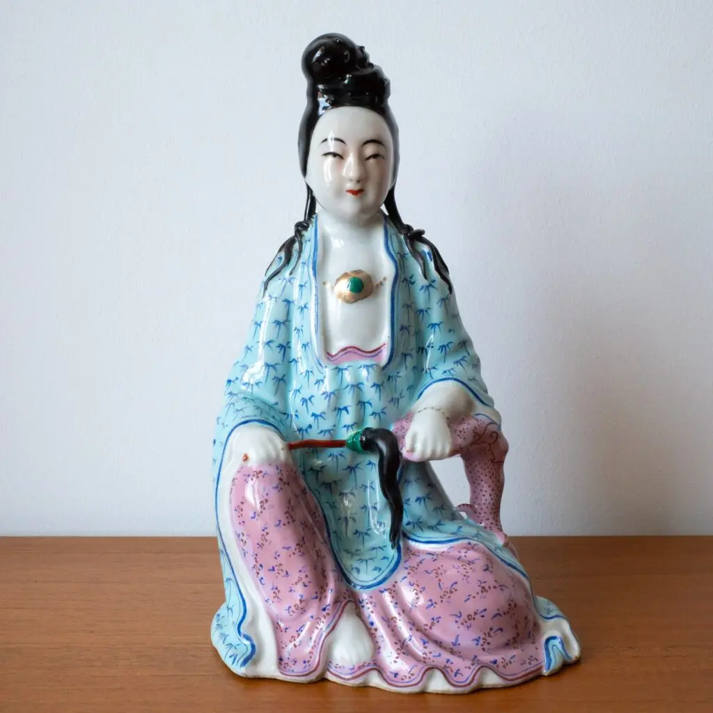 Fine vintage Chinese famille rose porcelain figurine of a seated Guanyin. Stamped inside. Really nice decorative piece. Tiny nibble to the tip of the thumb. Otherwise in great condition. Height: 18 cm.