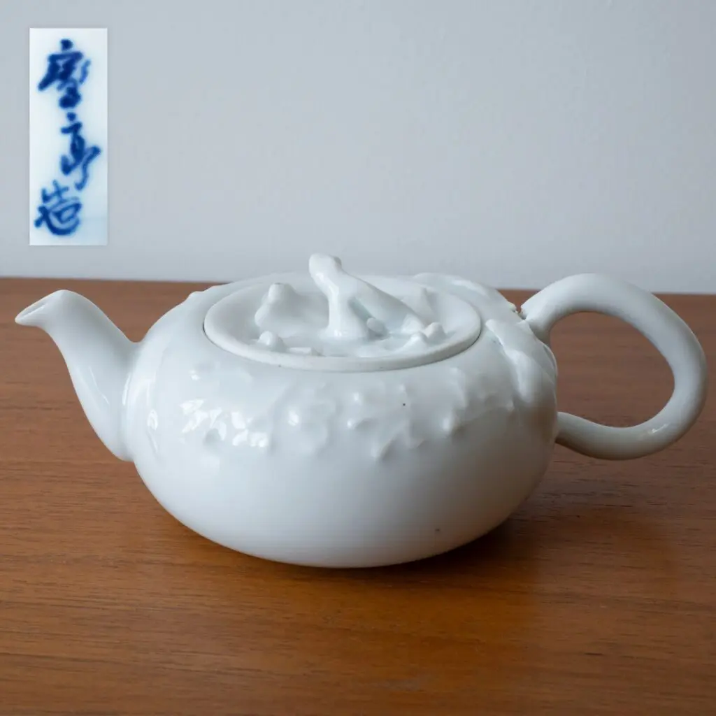 Rare antique Japanese miniature porcelain teapot by the potter Wake Kitei 和気亀亭. Relief decoration featuring flowers on one side and inscription on the other. Underglaze blue mark 亀亭造 ‘Made by Kitei’ under the cover. Width: 13 cm.
