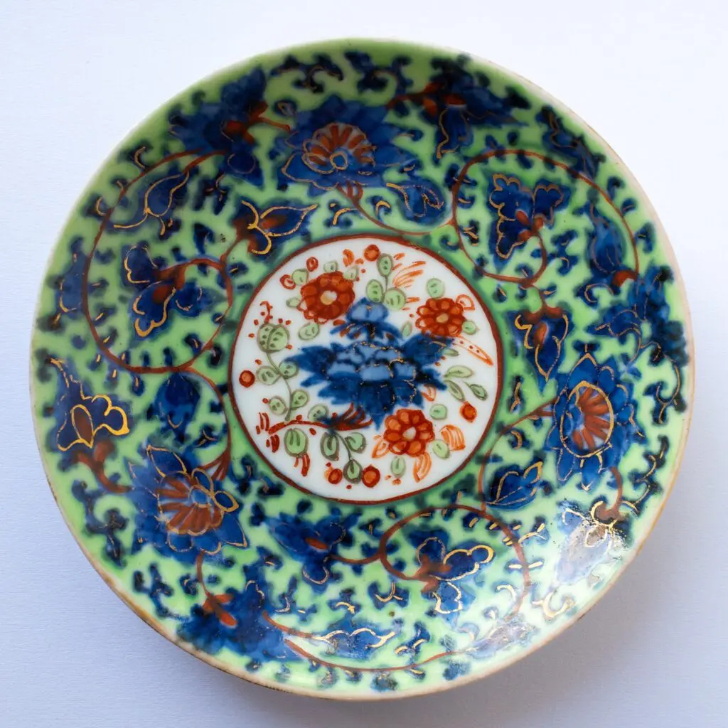 Lovely antique Chinese blue and white porcelain saucer decorated with lotus scrolls and with later European polychrome overglaze decoration with a lime green background. Base marked with typical rectangular iron red pseudo-Chinese mark. In excellent condition with minor age-related rubbing. No chips or cracks. Diameter: 10.5 cm.