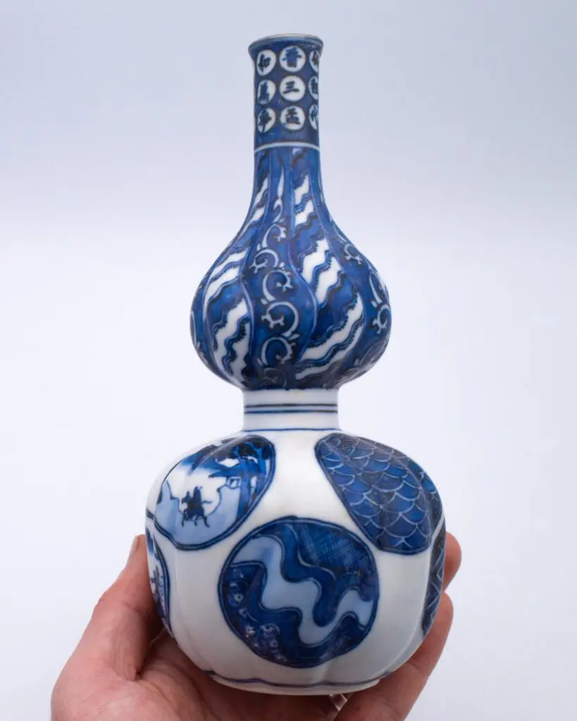 Beautiful Japanese lobed double gourd blue and white porcelain vase by Wada Kiriyama (和田桐山) of Kotoura kiln (琴浦窯), stamped ‘Kiriyama’ 桐山 to the base. Decorated all around with medallions featuring geometric designs and landscape scenes and with inscription around the neck. Height: 20 cm.