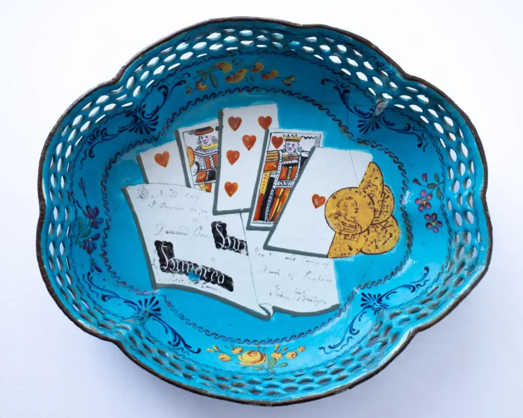 Rare 18th century English Bilston / Battersea enamel lobed gaming tray with pierced gallery, pale blue ground with scattered flowers and a central scene featuring cards, golden guineas and a bank note. Very similar example sold by Christie’s New York, 24 Jan 2001 lot 426 was described as Bilston, c.1770. Dimensions: approx. 13×11 cm.