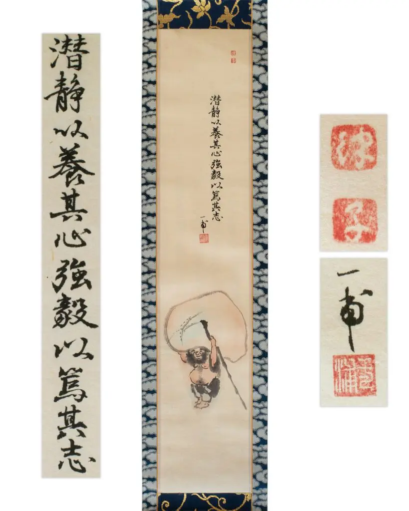 Beautifully done Japanese painting on paper featuring Hotei carrying his bag on his head and inscribed in Chinese with the motto of Sun Zuo: 潜静以养其心,强毅以笃其志 ‘Keep calm to nourish your heart, be strong and resolute to strengthen your will.’ Dimensions: scroll measures 126×17 cm; artwork measures 62.5×12.5 cm