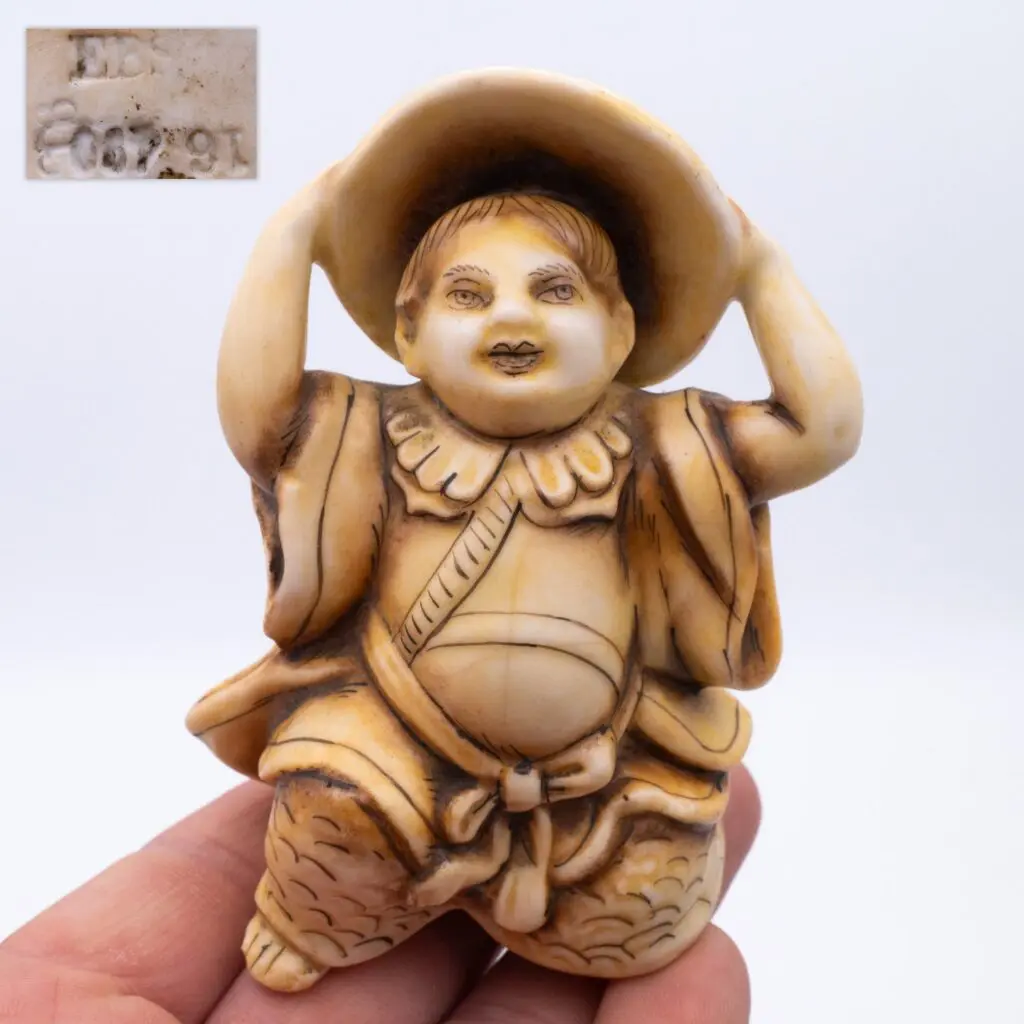 Very cute late 19th or early 20th century Japanese turned wood and papier mache container (humidor or caddy) in the form of a seated figure wearing a hat. Beautifully done with the most charming expression on his face. Height: 16 cm.