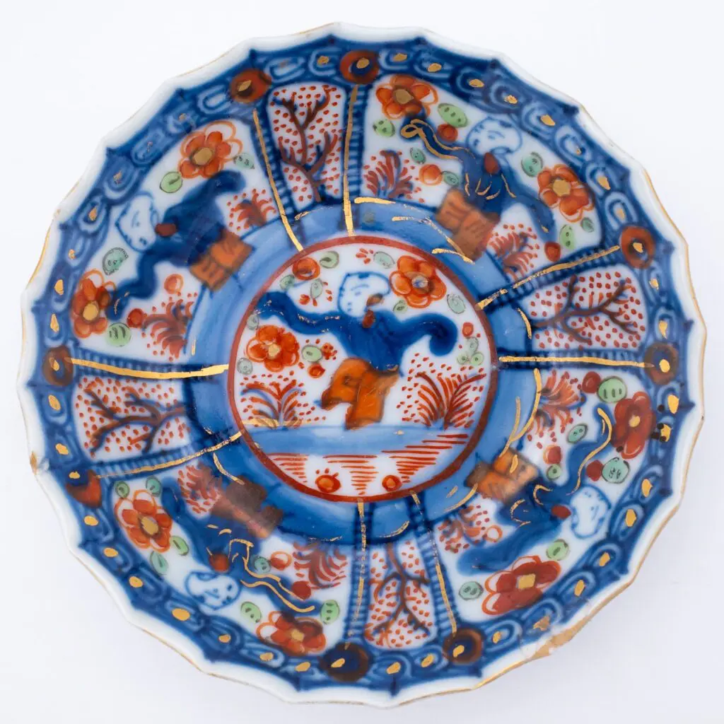 Lovely antique Chinese blue and white porcelain saucer decorated with panels featuring dancing boys. Polychrome overglaze decoration added later in Europe. Base marked with typical rectangular iron red pseudo-Chinese mark. Diameter: 10.5 cm.