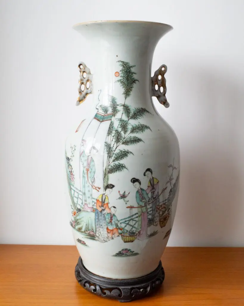 Large antique Chinese famille rose export porcelain vase with openwork handles. Depicting idyllic scene with ladies and a child in the garden collecting flowers. Gorgeous decorative piece with its original wooden stand. Height: 43 cm / 17 inches (not including the stand).