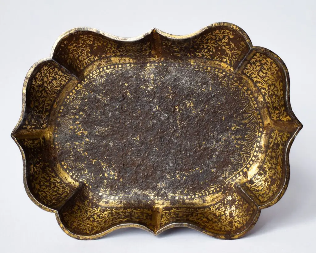 Stunning antique 19th century North Indian damascene steel tray with intricate gold inlay koftgari work featuring beautifully done foliate scrolls. Nice, genuine old example for a collection! Age-related surface wear and corrosion as seen in the photos. Metal is thick and tray remains very sturdy. Dimensions: 13.2×9.4 cm