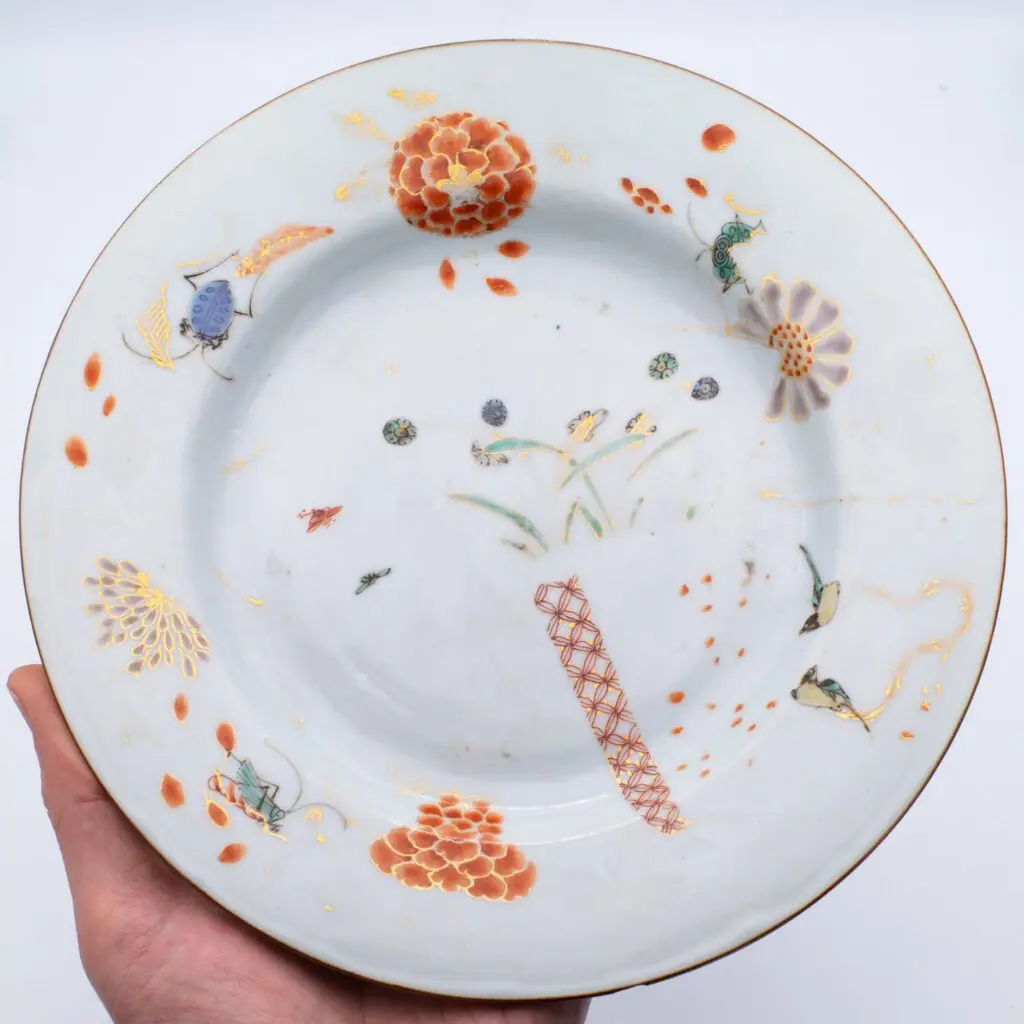 Rare 18th century Chinese export porcelain dish decorated in unusual pattern featuring various insects, birds and flowers. Likely dating to the Qianlong period. Age-related rubbing as photographed. Diameter: 22 cm.