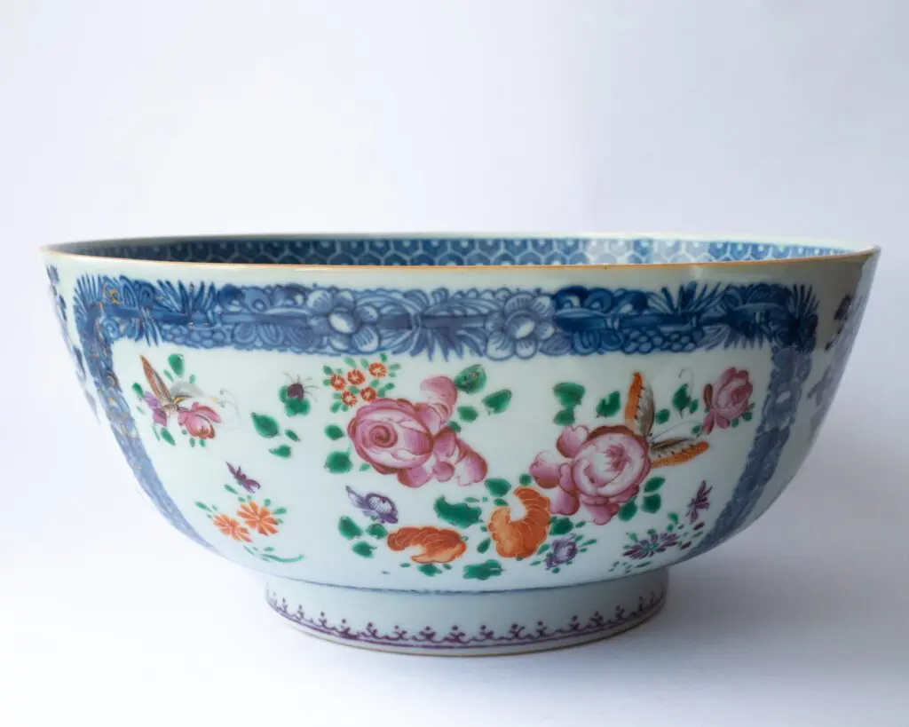 Large Chinese Qianlong period export porcelain bowl with underglaze blue floral sprays and cartouches combined with overglaze famille rose decoration featuring flowers and butterflies. Interior decorated with diaper border around the rim and a large central medallion with more flowers. Lovely piece of 18th century Chinese export porcelain. Diameter: 19.6 cm.