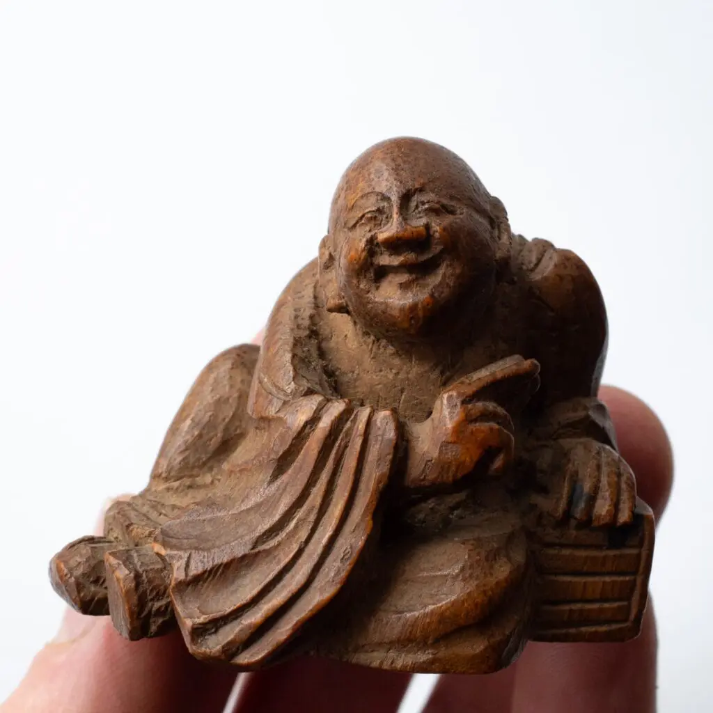 Antique Japanese Meiji Lacquered Wood Papier Mache Seated Figure Humidor Jar