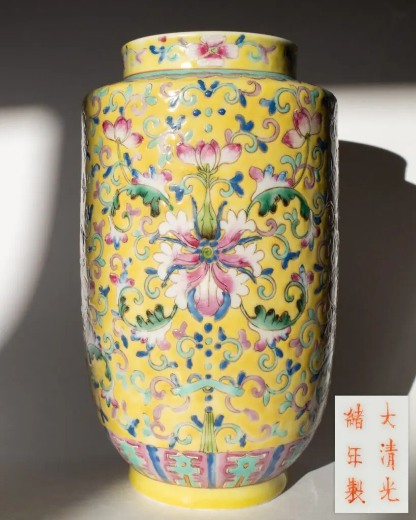 Fine antique Chinese yellow-ground porcelain vase (or jar missing its cover), decorated all around with intricate lotus scrolls, bats and auspicious Shou characters. Marked to the base with a six-character Guangxu (1875-1908) reign mark 大清光緒年製 and possibly of the period or shortly after (Republic period). Height: 19.5 cm.