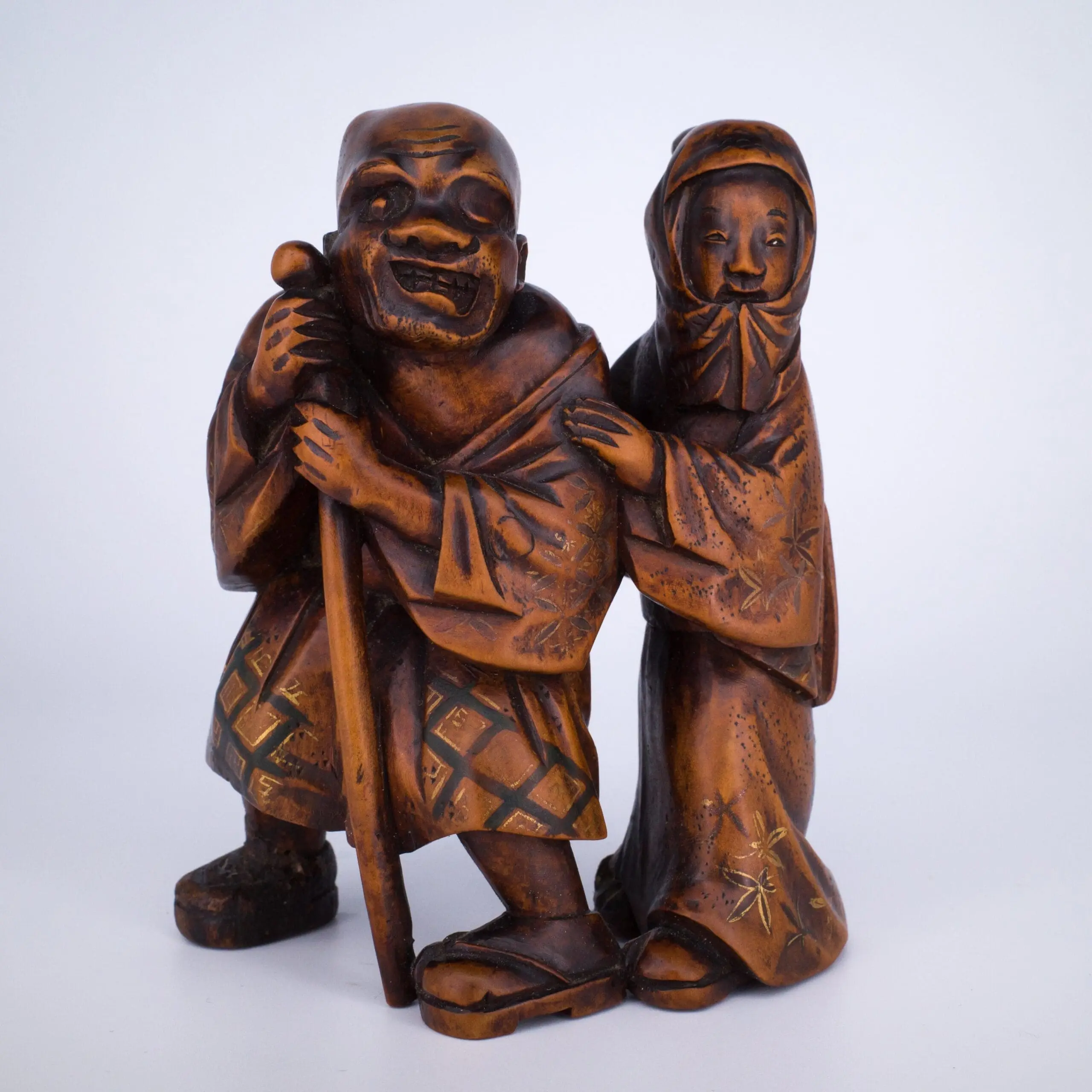Rare Japanese boxwood carving depicting a blind man leaning on his cane and being led by a young female – possibly his daughter. An unusual and touching theme rarely depicted by Japanese artists. Kimonos of both figures are heavily decorated with hand-painted gilt patterns. Old repair to the leg of the man and small break to the woman’s kimono near the base of the figure. Rubbing to the gilding consistent with age.