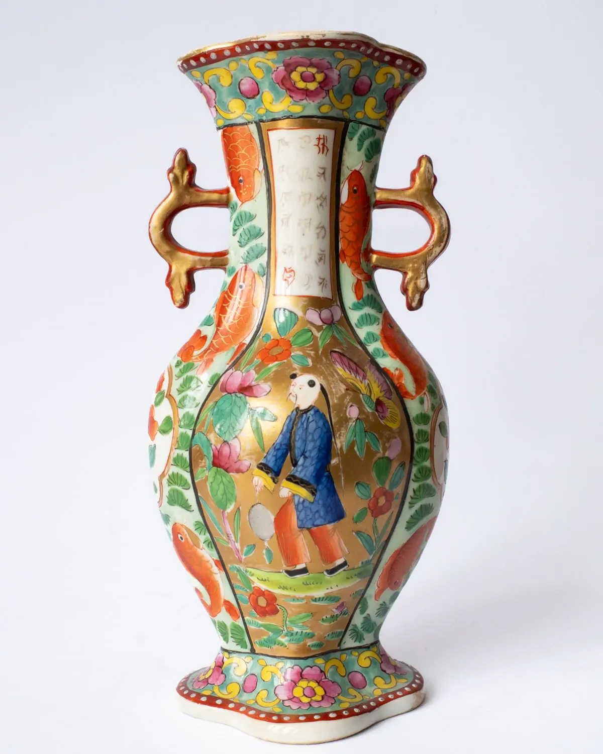 Rare early 19th century English Chinoiserie Miles Mason ironstone vase of quatrefoil form and with gilt handles. Decorated in a vibrant Chinese style pattern with figures, fish, flowers and mock Chinese inscriptions. Typical rectangular pseudo-Chinese iron red mark to the base.