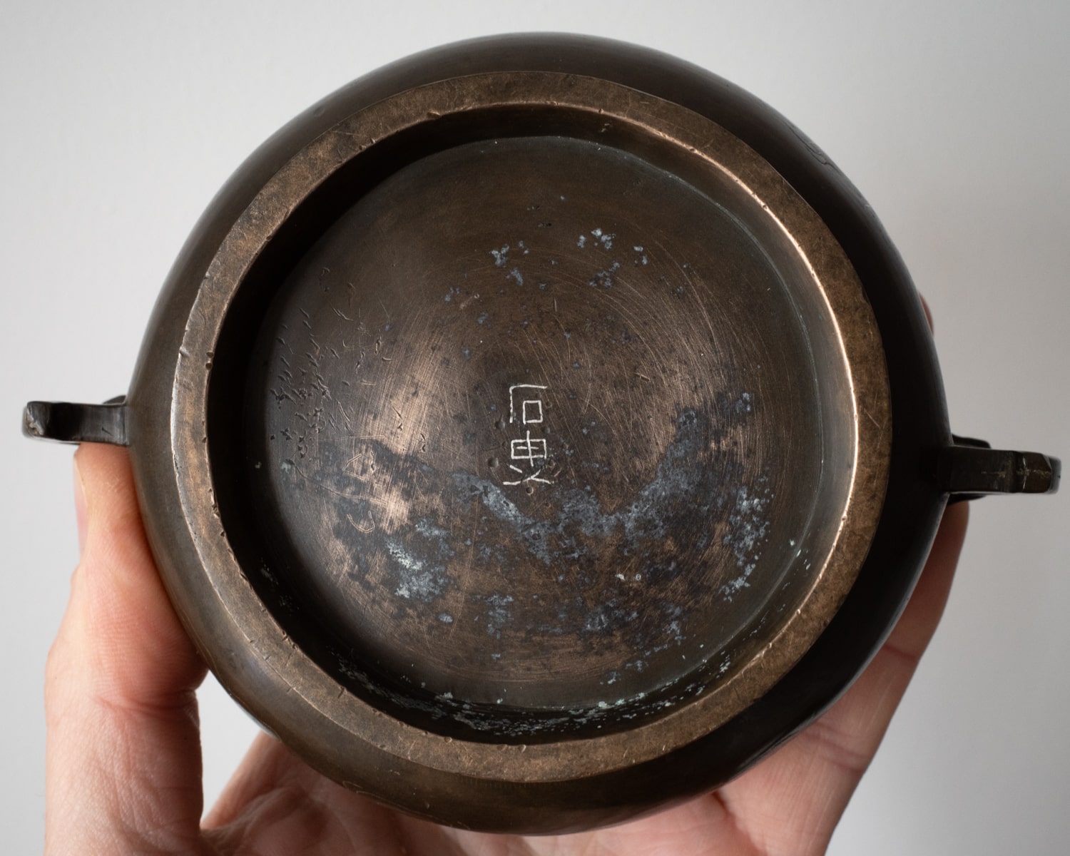 Rare antique Chinese bronze incense burner of compressed form, inlaid in silver on each side with three bats amidst clouds and flanked on the shoulder by a pair of handles. Base marked with a typical stylized ‘Shishou’ mark 石叟.