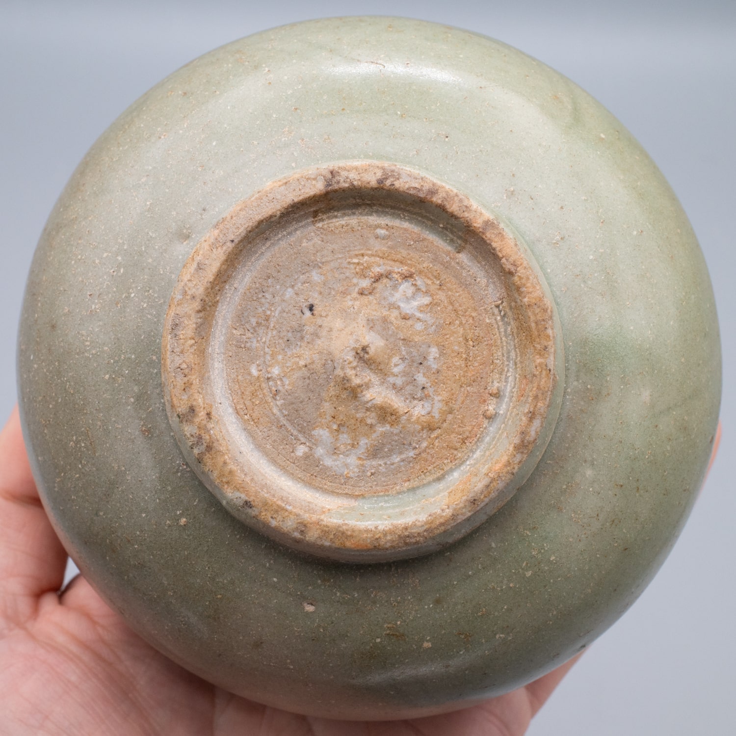 Antique Chinese Longquan celadon glazed stoneware bowl with underglaze incised decoration. Stylistically consistent with late Yuan and early Ming dynasty examples.