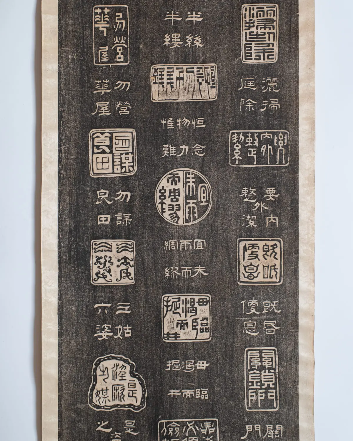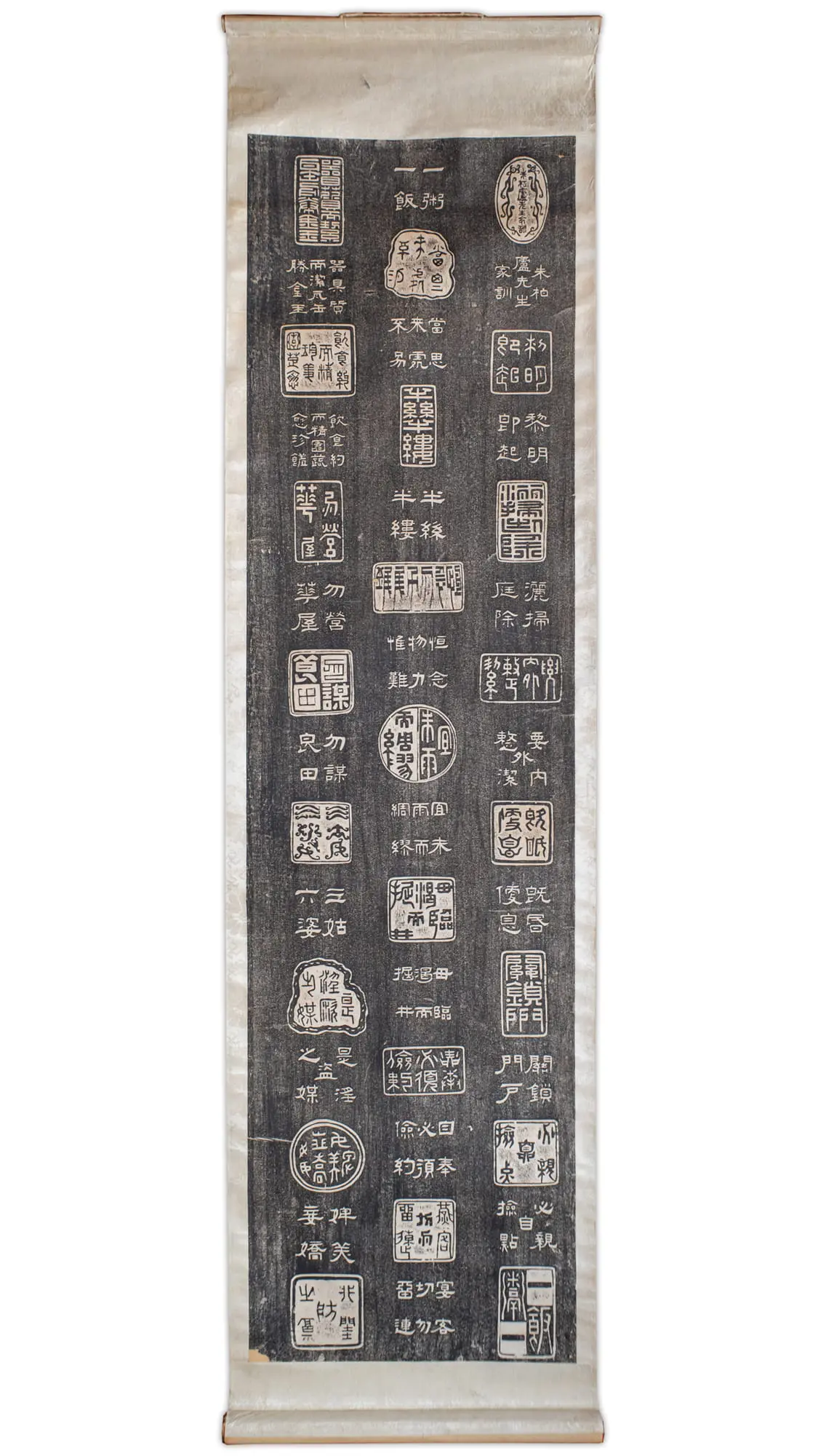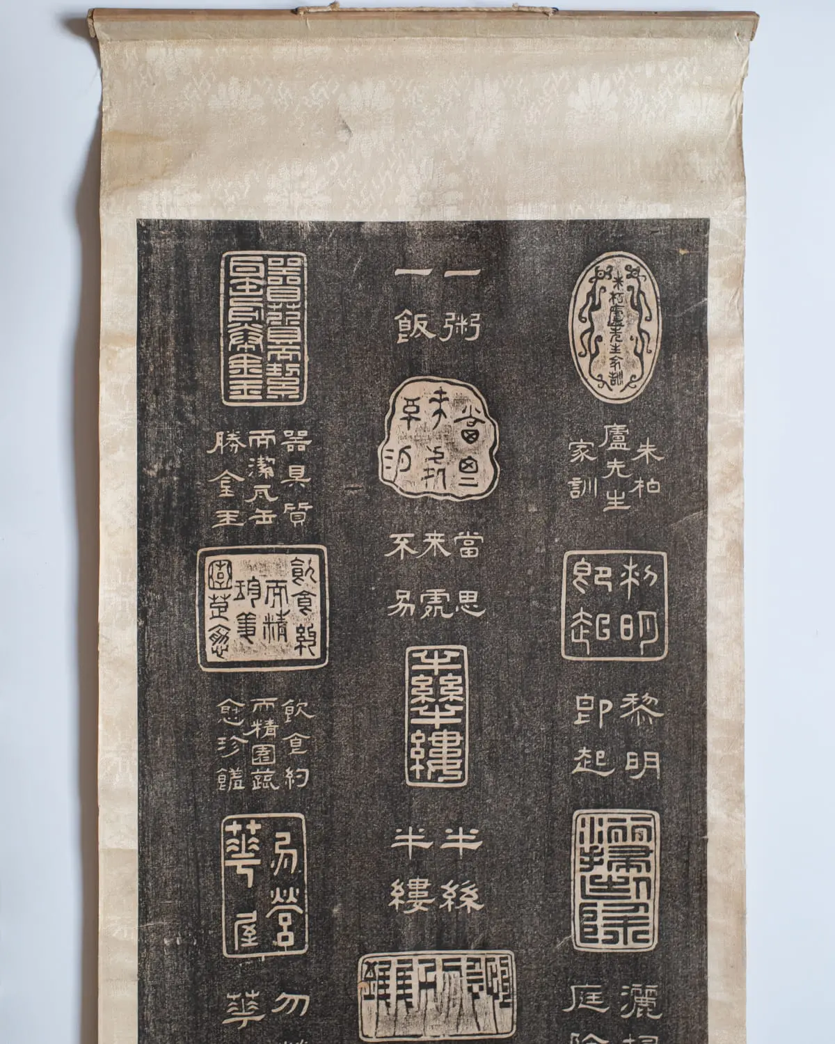 Rare and quite unusual Chinese ink rubbing on paper featuring ‘Family Motto of Zhu Bailu’ (朱柏廬先生家訓), also known as ‘Zhu Bailu’s Maxims for Managing a Household’ (朱柏廬治家格言). Each depicted in the form of a seal and transcribed in traditional characters below. Very interesting piece for a scholar’s study.