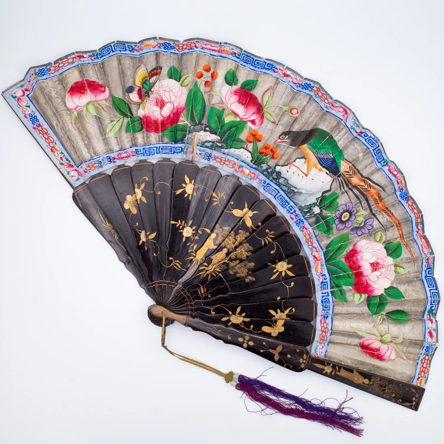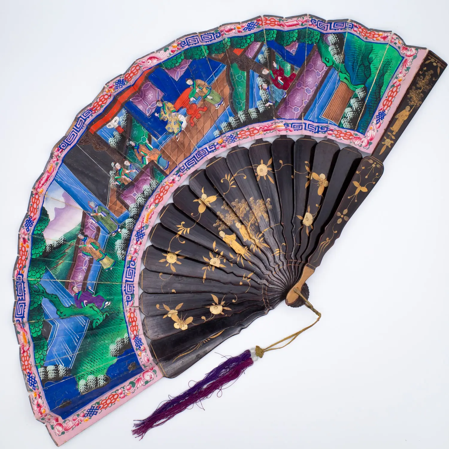 Beautiful 19th century Chinese gilt lacquered export fan with hand-painted panels depicting a nature scene on one side and classic court scene with various figures on the other. Beautifully detailed and well-preserved example!