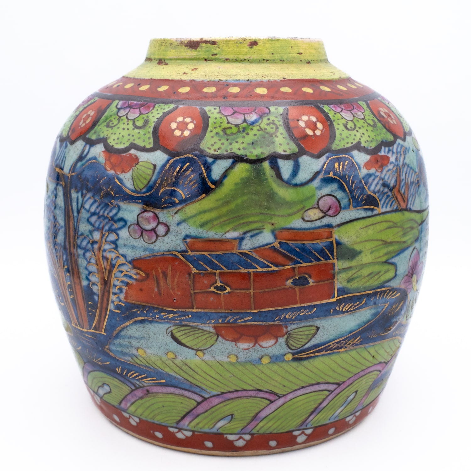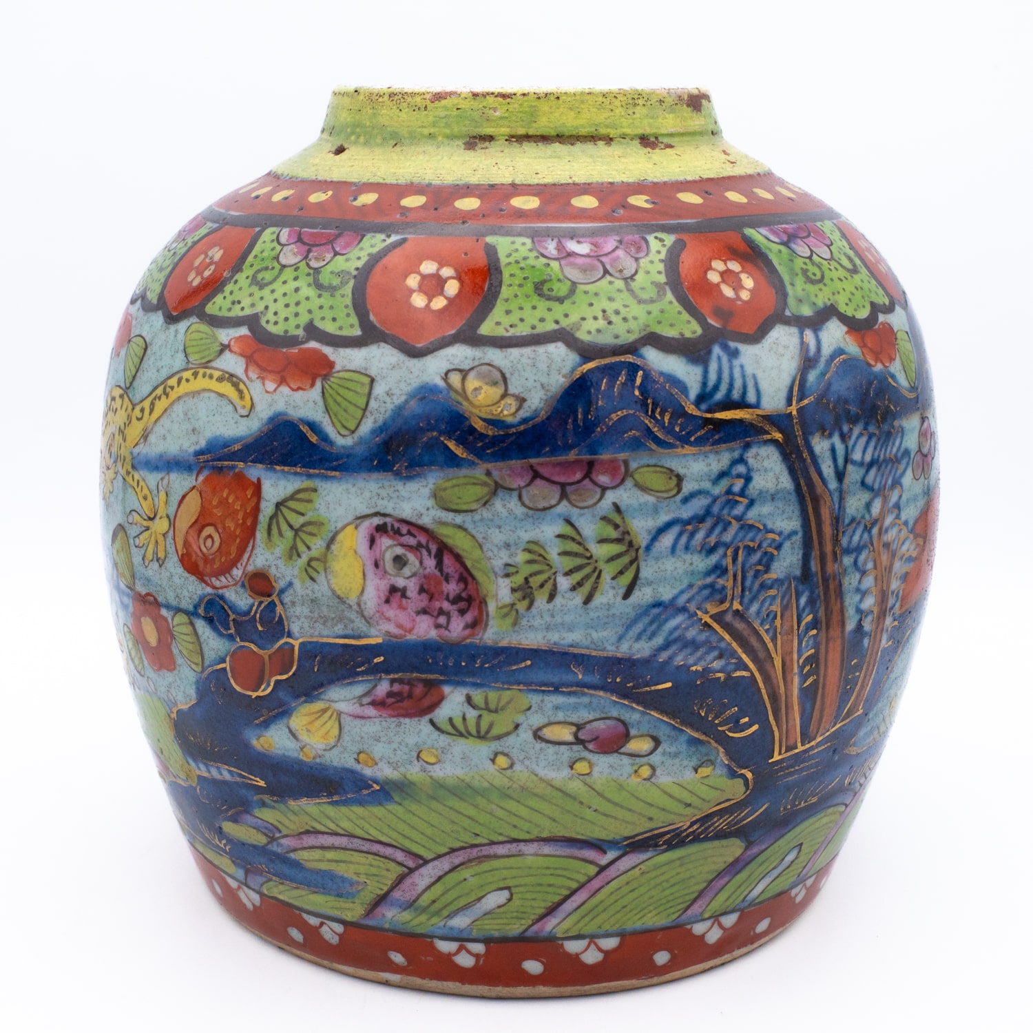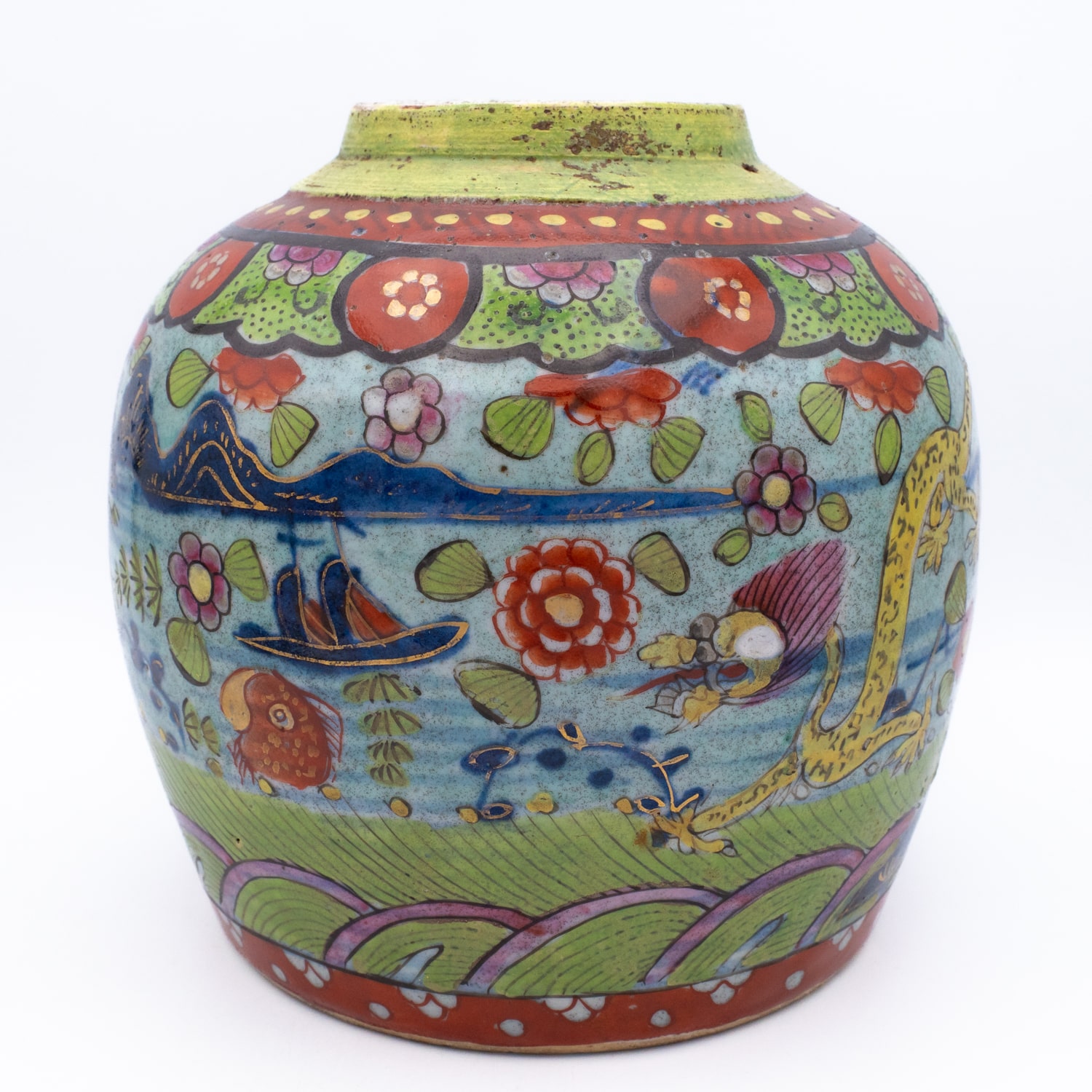Charming antique Chinese ‘clobbered’ blue and white jar with later European overglaze decoration. Featuring a continuous landscape with a dragon, various fish and floral sprays. Lovely piece for a collection.