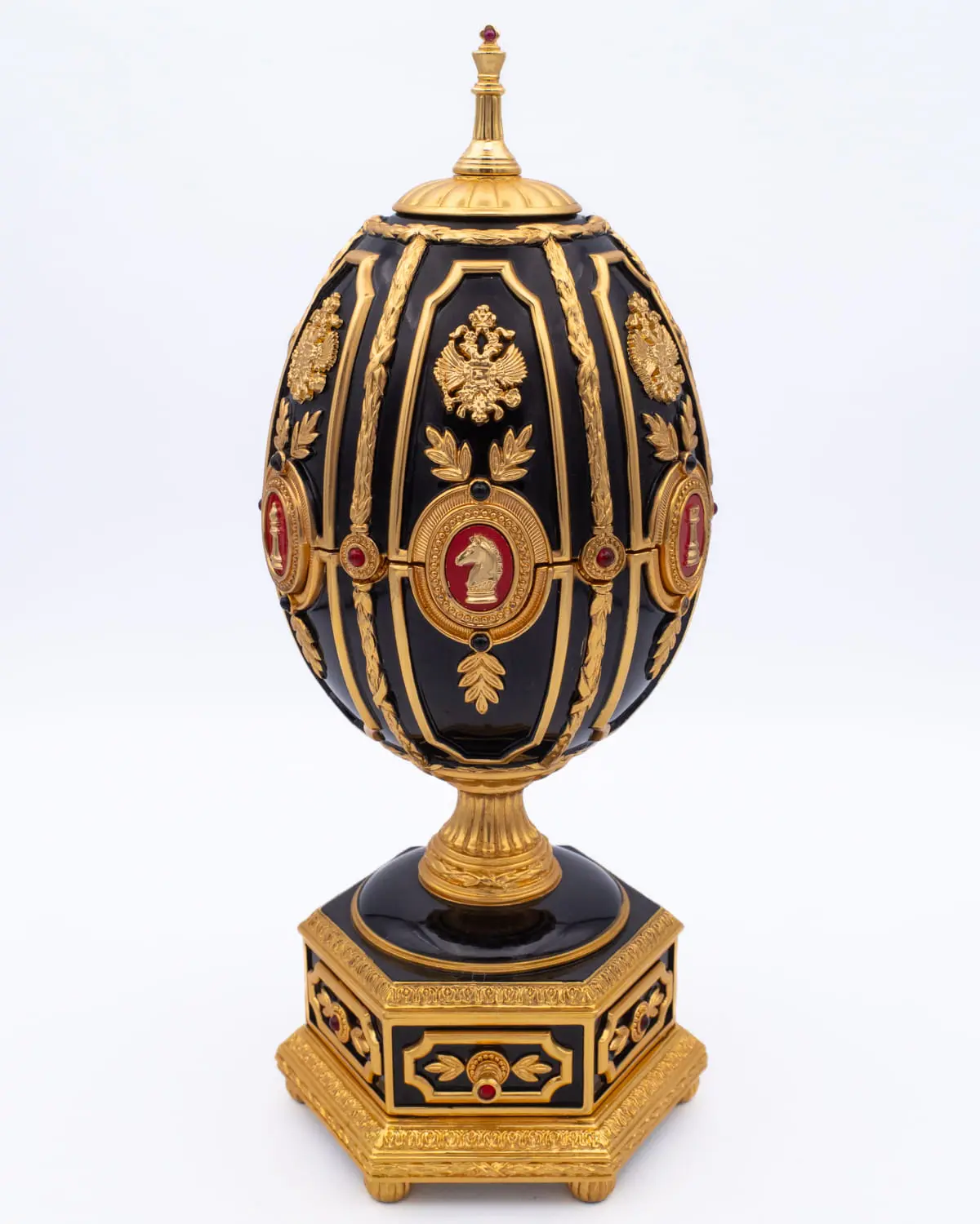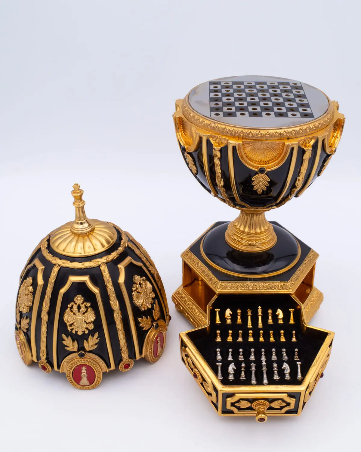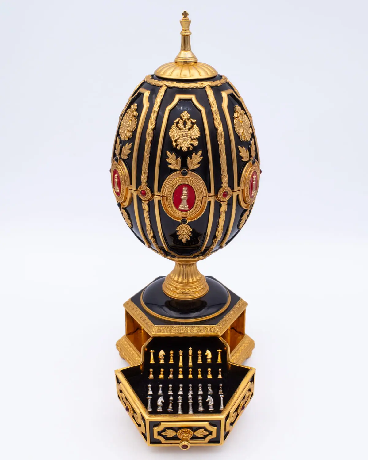 Rare and beautifully detailed Imperial Jeweled Egg Chess Set designed by the famous House of Fabergé for Franklin Mint in the opulent tradition of Peter Carl Fabergé, goldsmith and jeweller to the czars of imperial Russia. The luxurious collector egg is painted with red and black enamels and lavishly accented with 22 carat gold, sterling silver and set with a rich red ruby. The egg opens to reveal a miniature chess board embellished with sterling silver. The 32 chess pieces are accented in either 22 carat gold or sterling silver. They can be stored in a drawer provided in the base of the egg.