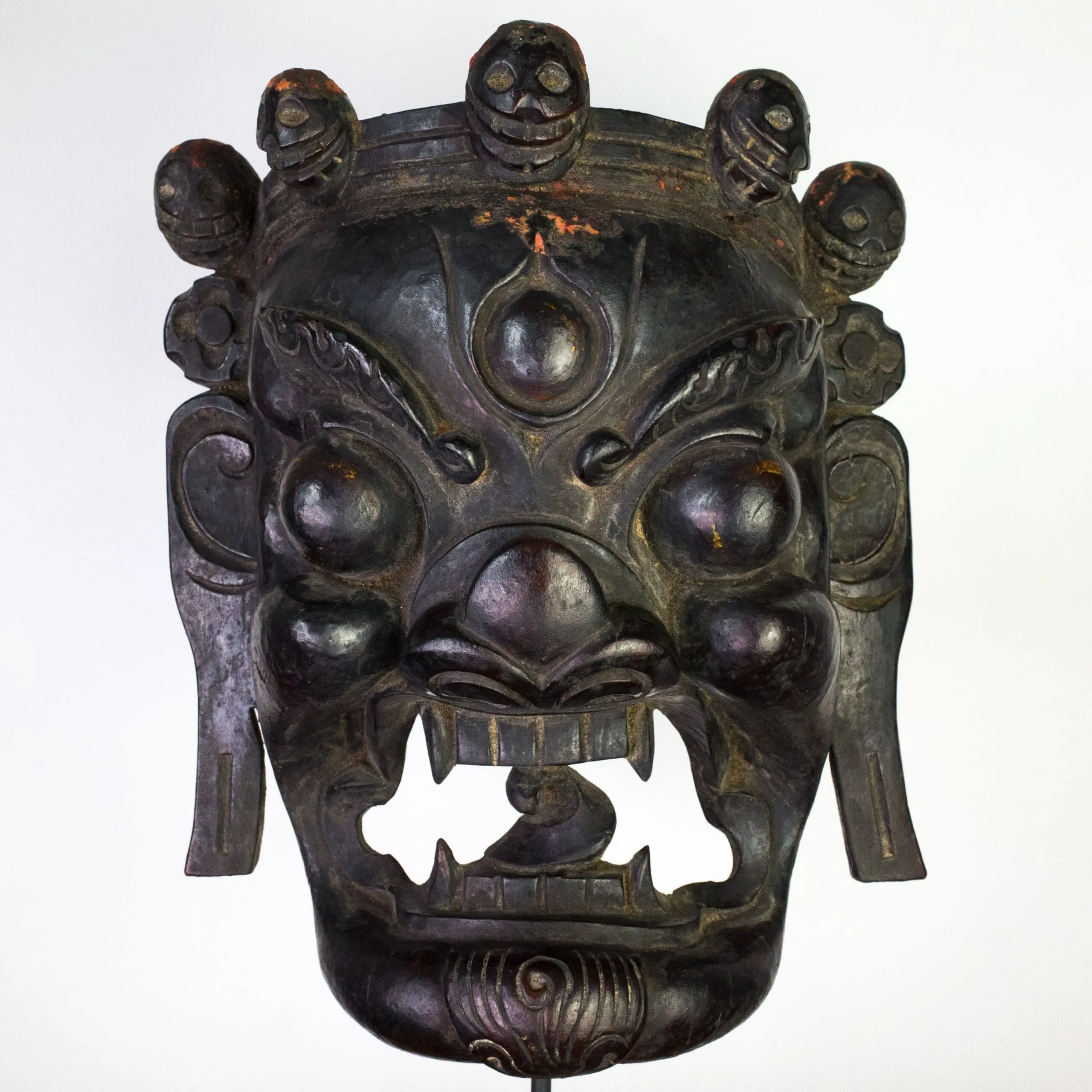 Exceptional 19th century Tibetan ceremonial mask of a protective wrathful deity Mahakala. Made out of heavy hardwood with beautiful dark surface patina and with visible remnants of original polychrome pigments. A textile ring on the inside used to keep the mask stable on the dancers head. Prominent wear to the top edge of the mask just above the ring, indicating its regular ritual use.