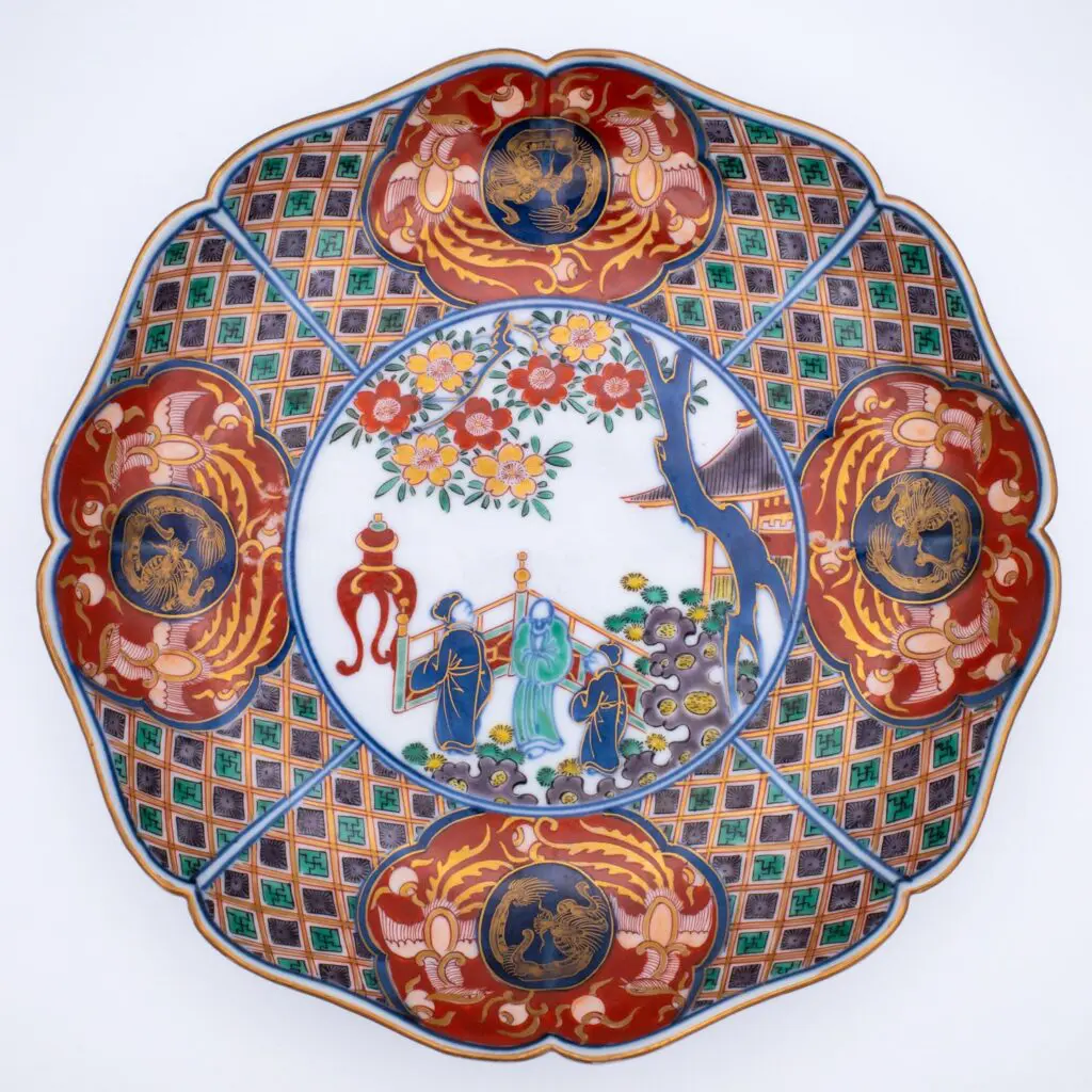 Stunning Japanese Imari porcelain dish with shaped rim. Featuring a large central medallion with scholars in the garden, framed by four cartouches with Ho-o birds and dragons. All set against nicely done green and aubergine diaper background. Underglaze blue apocryphal Chinese Chenghua reign mark underneath.
