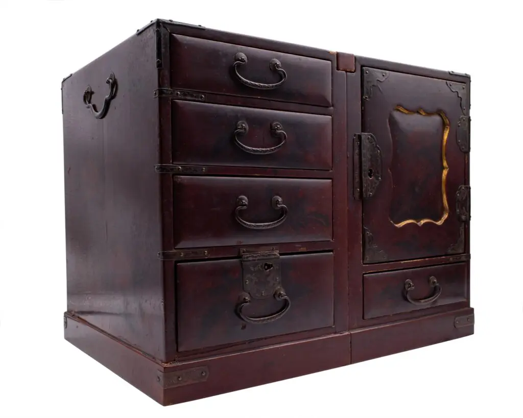 Beautiful early 20th century Japanese red lacquered table cabinet with 7 drawers, two of which are behind hinged doors with nicely hand-painted bird and floral decoration. Unique design of this cabinet allows it to be separated into two independent units – originally designed with additional board at the top that would transform it into a miniature desk. Would make a great jewellery or trinket box.