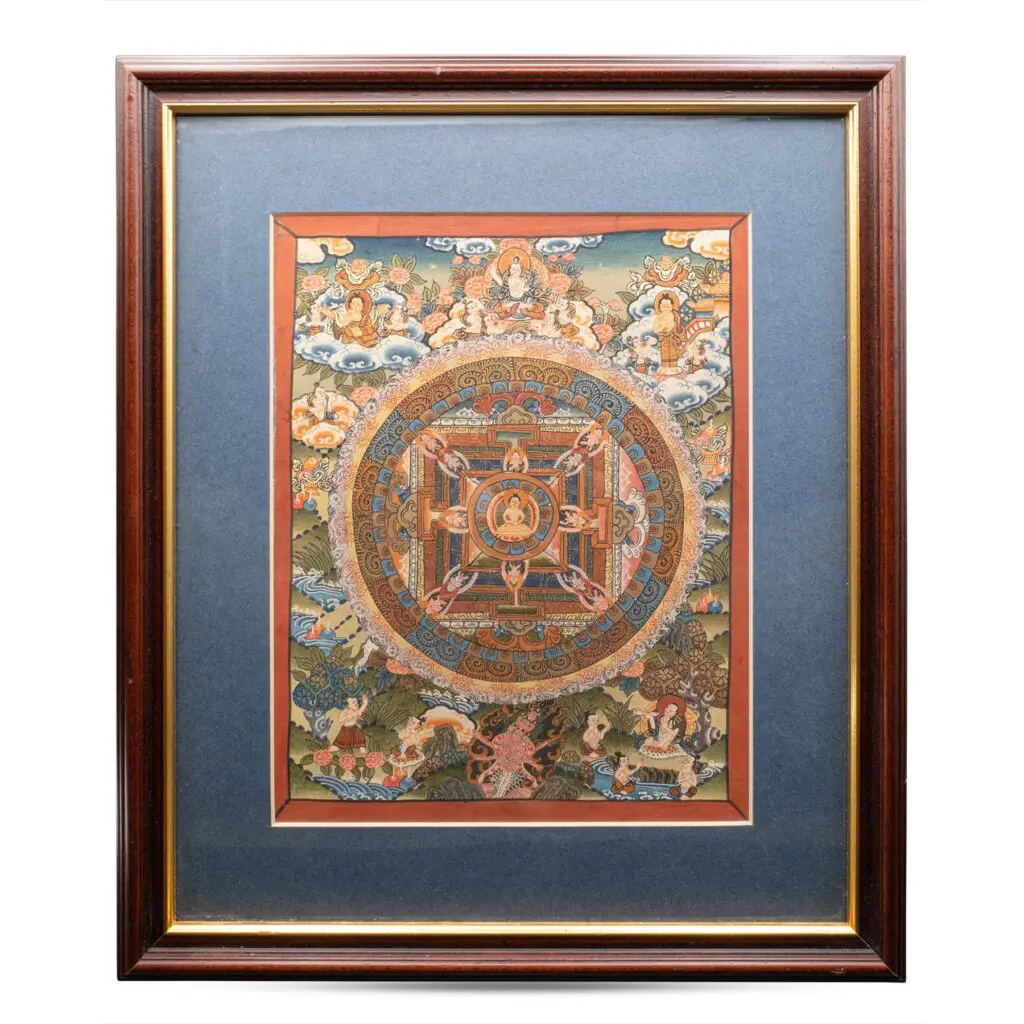 Vintage Hand-Painted Tibetan Buddha Mandala Thangka / Tangka on Canvas. Framed.