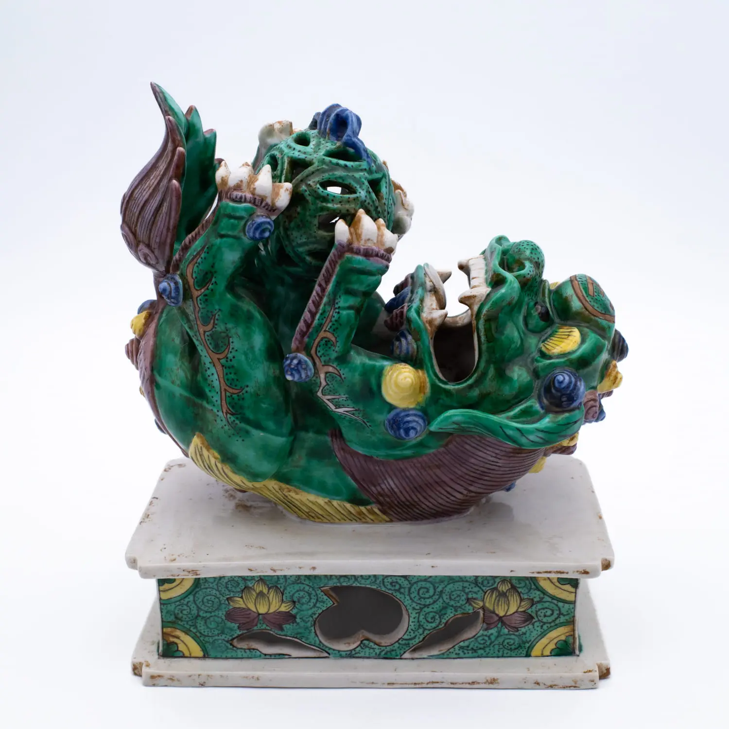 Really nice famille verte style Chinese porcelain figure of a playful foo lion lying on its back and with a brocade ball between its paws. Sitting atop a rectangular openwork carved pedestal decorated with floral and foliate patterns. Height: 14.5 cm.