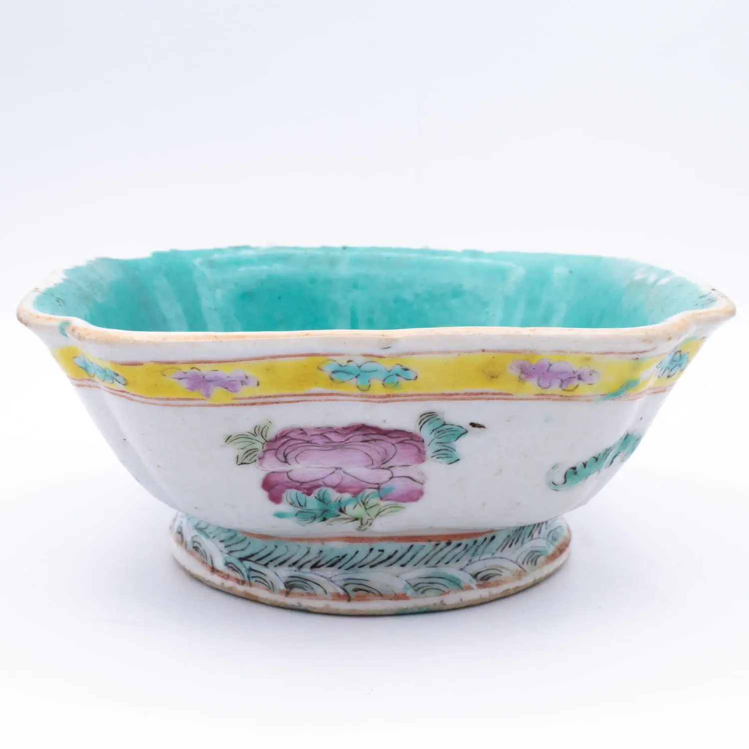 A late Qing dynasty square footed bowl with famille rose decoration featuring flowers and bats flying above the rolling waves. Stamped to the base. Age-related surface wear and tension line to the body as photographed. Please enlarge and study all provided photographs as they form part of the description. Dimensions: 15x15x7 cm