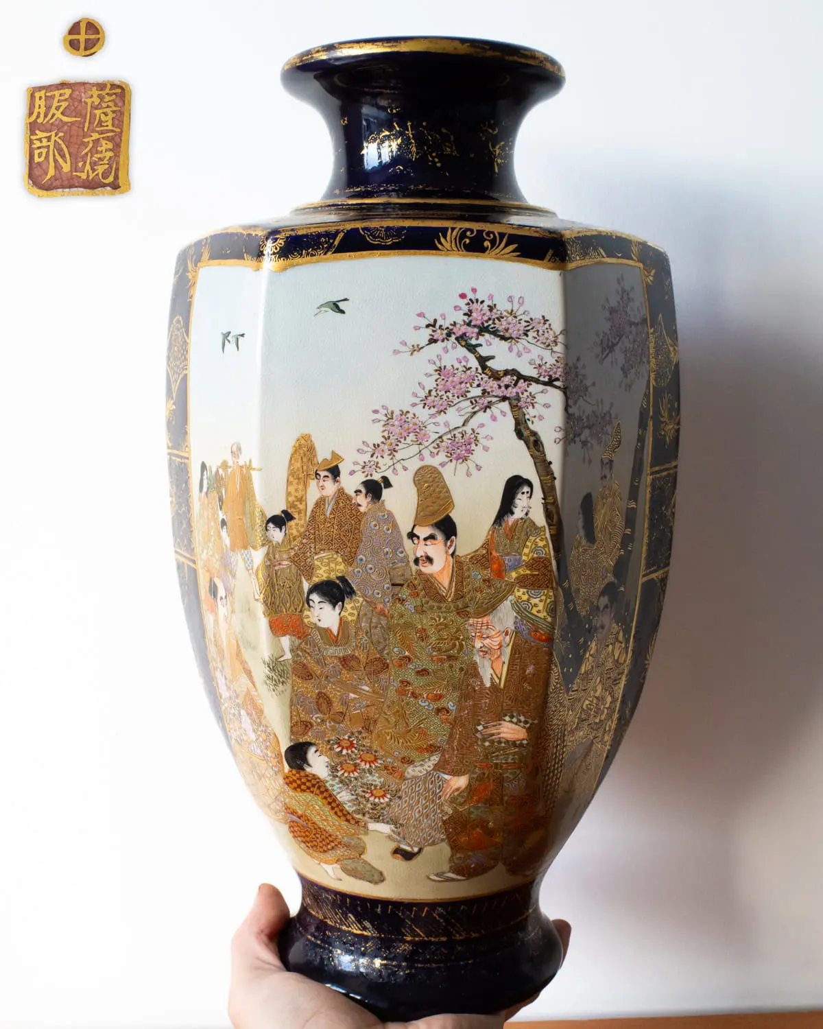Stunning large antique Japanese Meiji period Satsuma pottery vase of hexagonal form. Decorated with two intricately painted scenes featuring numerous figures in heavily gilded kimonos and with blossoming cherry trees and birds behind them. All set against cobalt blue background embellished with gold butterflies and geometric designs. Base marked with the Shimazu mon and signed 薩摩焼 服部 ‘Satsuma ware, Hattori’. Height: 37 cm / 14.5 inches.