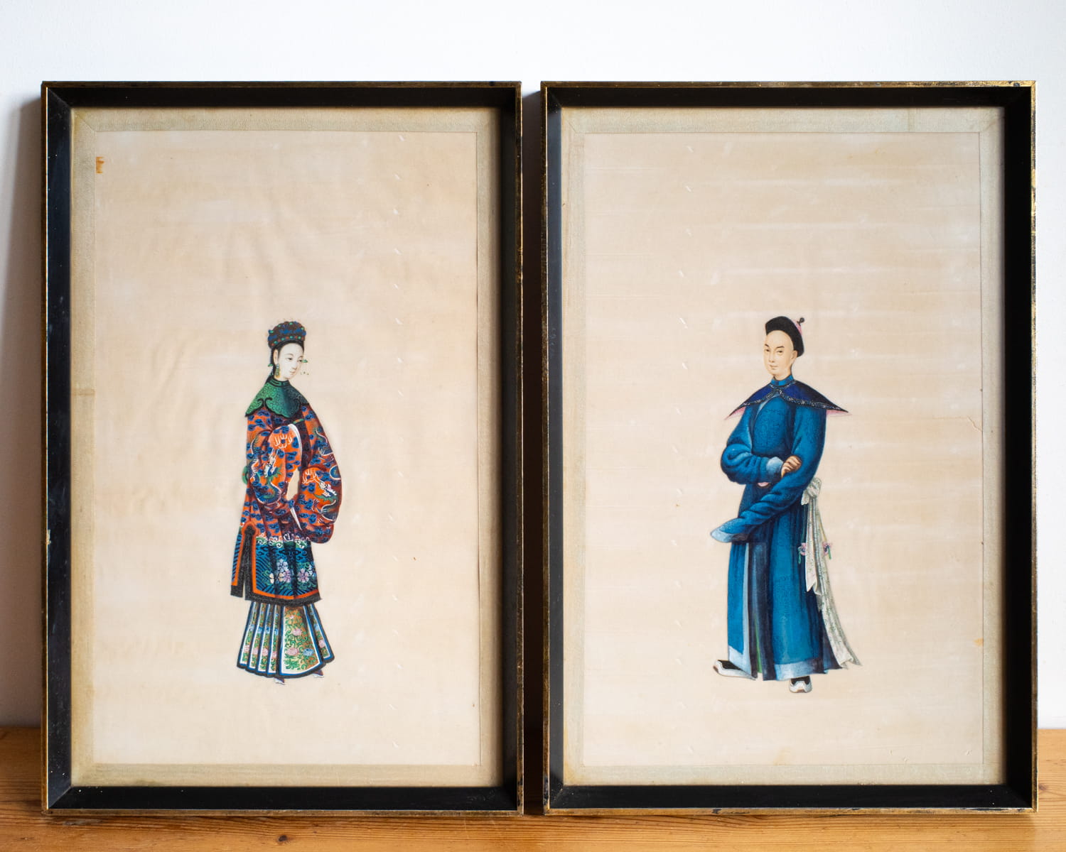 Fine pair antique Chinese export gouache paintings on pith paper depicting Qing dynasty court officials in traditional robes. Beautifully painted examples, nicely framed and glazed. Dimensions: left painting measures 32×21 cm, right one 32×21.5 cm, including the frames.