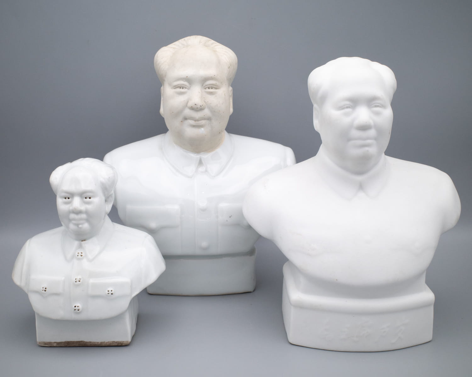 Set of three 20th century Chinese porcelain busts of the Chairman Mao Zedong. Bisque bust on the right is of a more commonly seen type but the other two – large one with unglazed head and the small one with openings in its eyes and buttons – appear to be quite rare as we were unable to find any other similar examples for reference. Interesting pieces to add to your collection! Height: 12 cm, 18.5 cm and 20 cm tall.