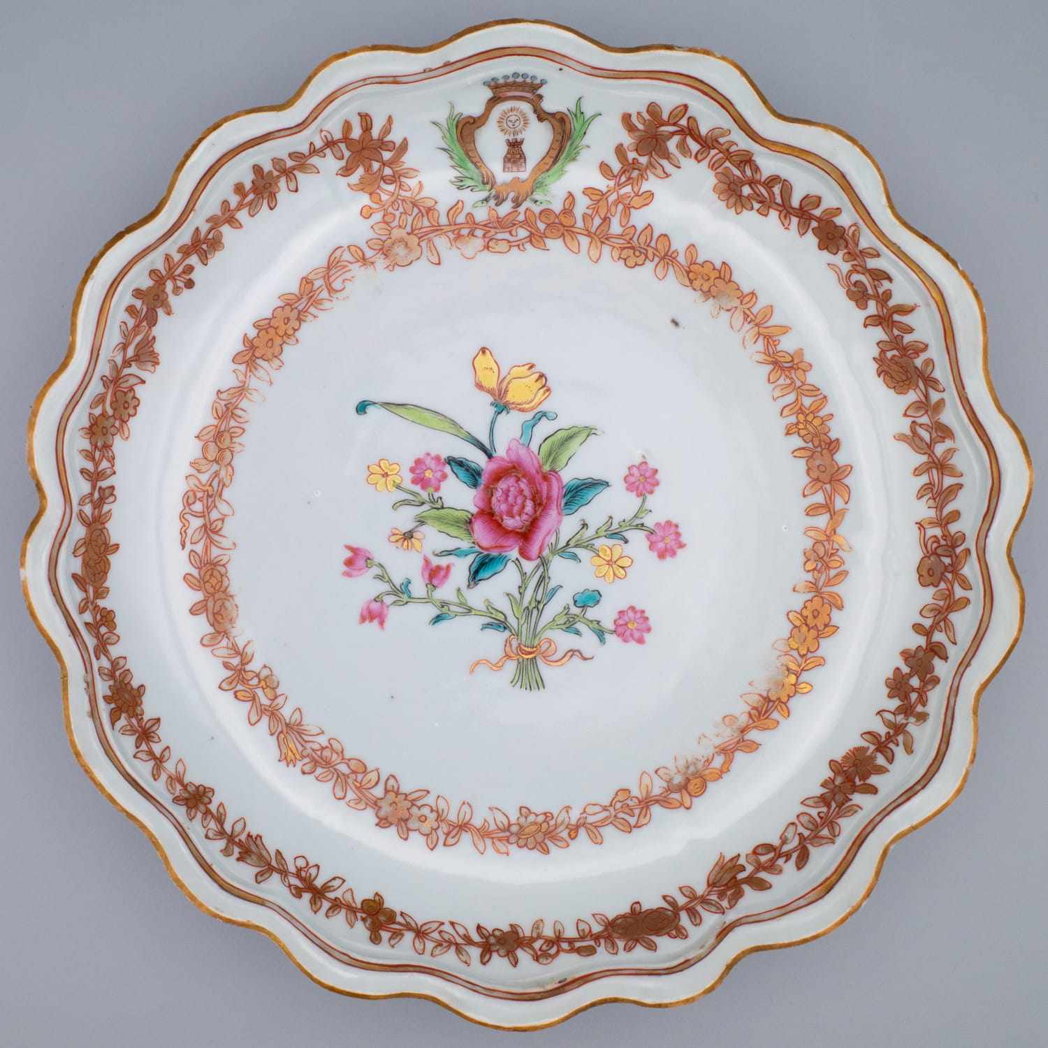 Rare 18th century Chinese Qianlong period armorial export dish with wavy rim. Featuring a European coat of arms (possibly French), surrounded by iron-red and gilt floral garlands and with a large bouquet in the middle. Diameter: 22 cm.