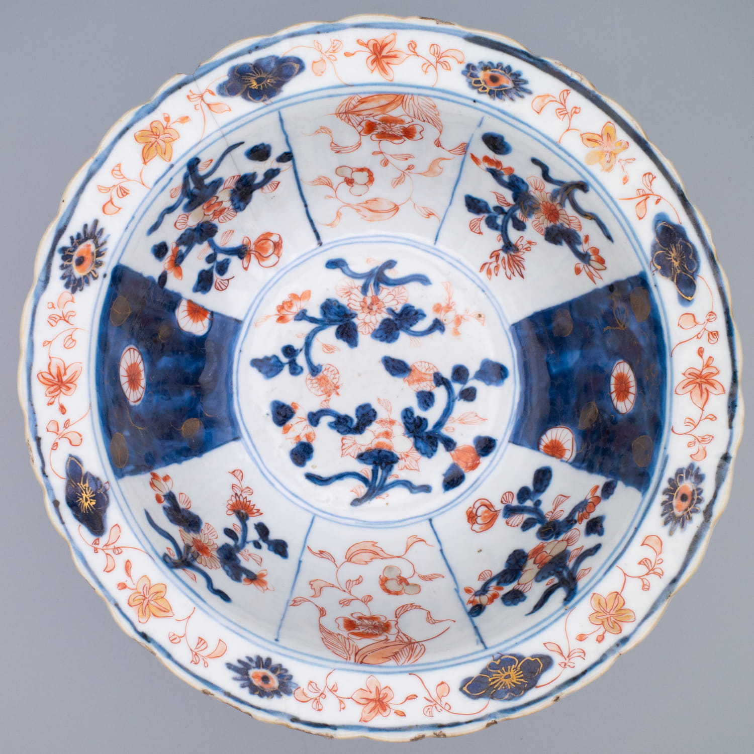 Rare antique Chinese Kangxi period Imari decorated klapmuts export porcelain bowl made during the late 17th or early 18th century. Featuring typical radiating panels with various floral sprays, both on the inside and on the outside of the bowl. Diameter: 21.5 cm.