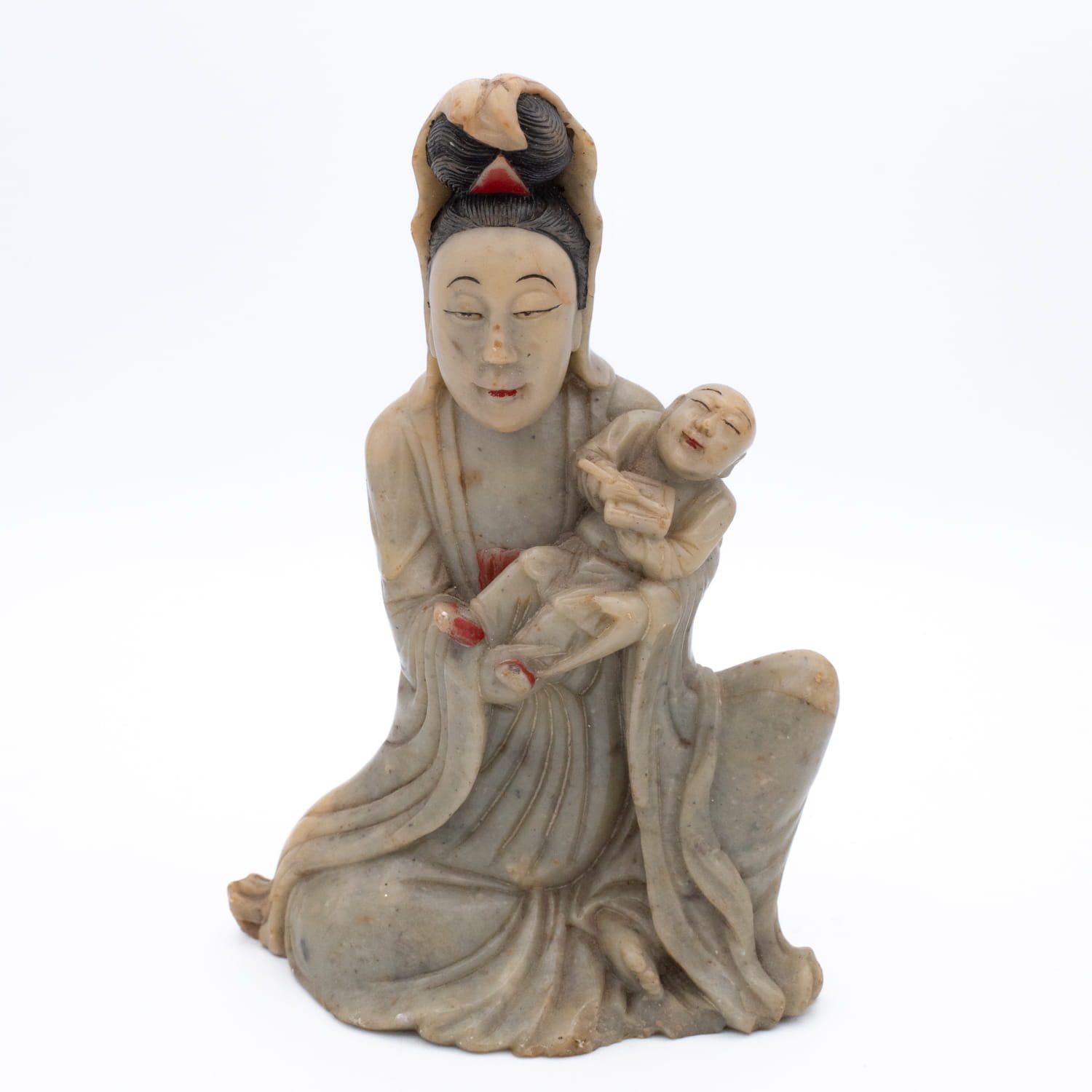 A charming Chinese soapstone figure of seated Guanyin in long flowing robes holding a child in her arms. Late Qing or Republic period example. Height: 14 cm.