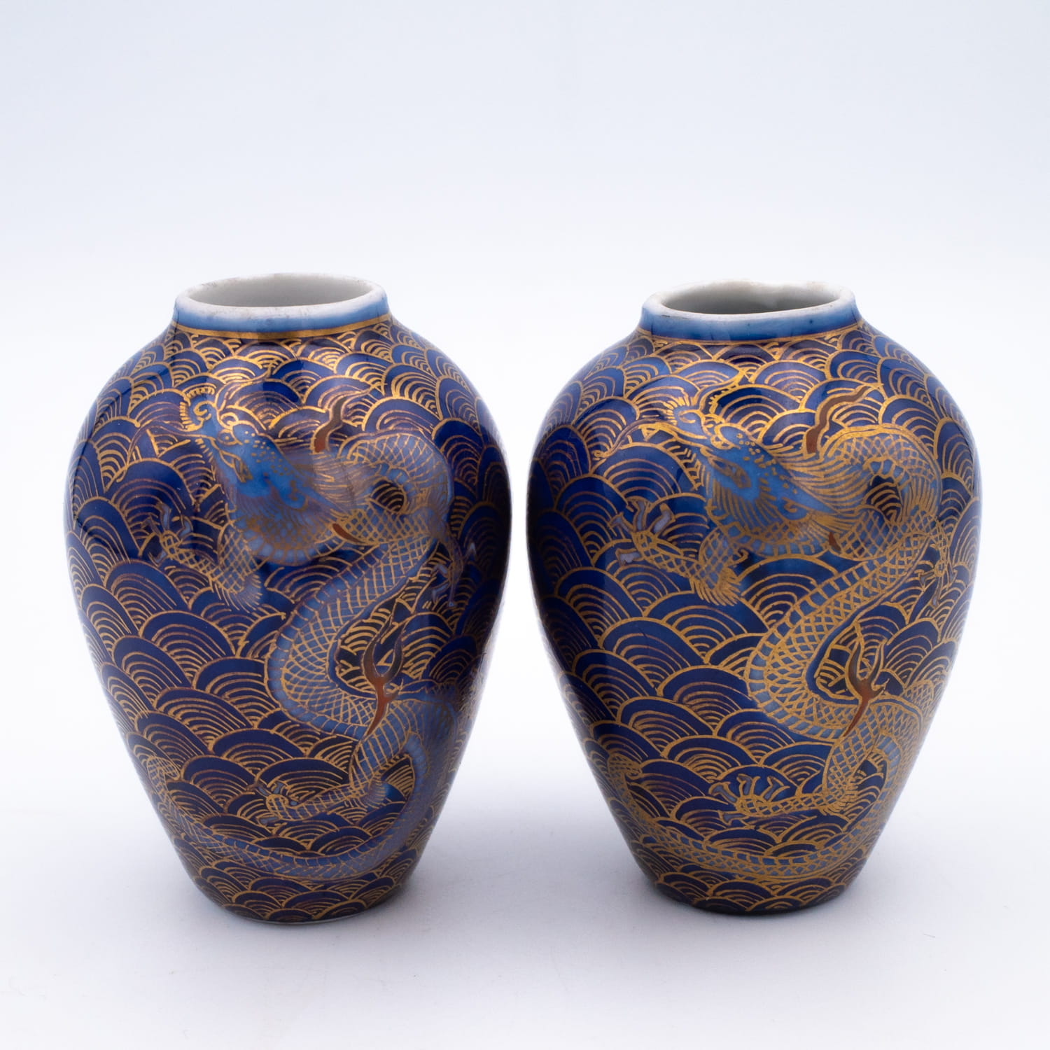 Lovely pair of Japanese miniature porcelain vases by Fukagawa Seiji. Each decorated with a fierce dragon amongst rolling waves. Bases marked with a typical Mt. Fuji logo and signed ‘Fukagawa Sei’ 深川製 (Made by Fukagawa). Height: 6.5 cm.