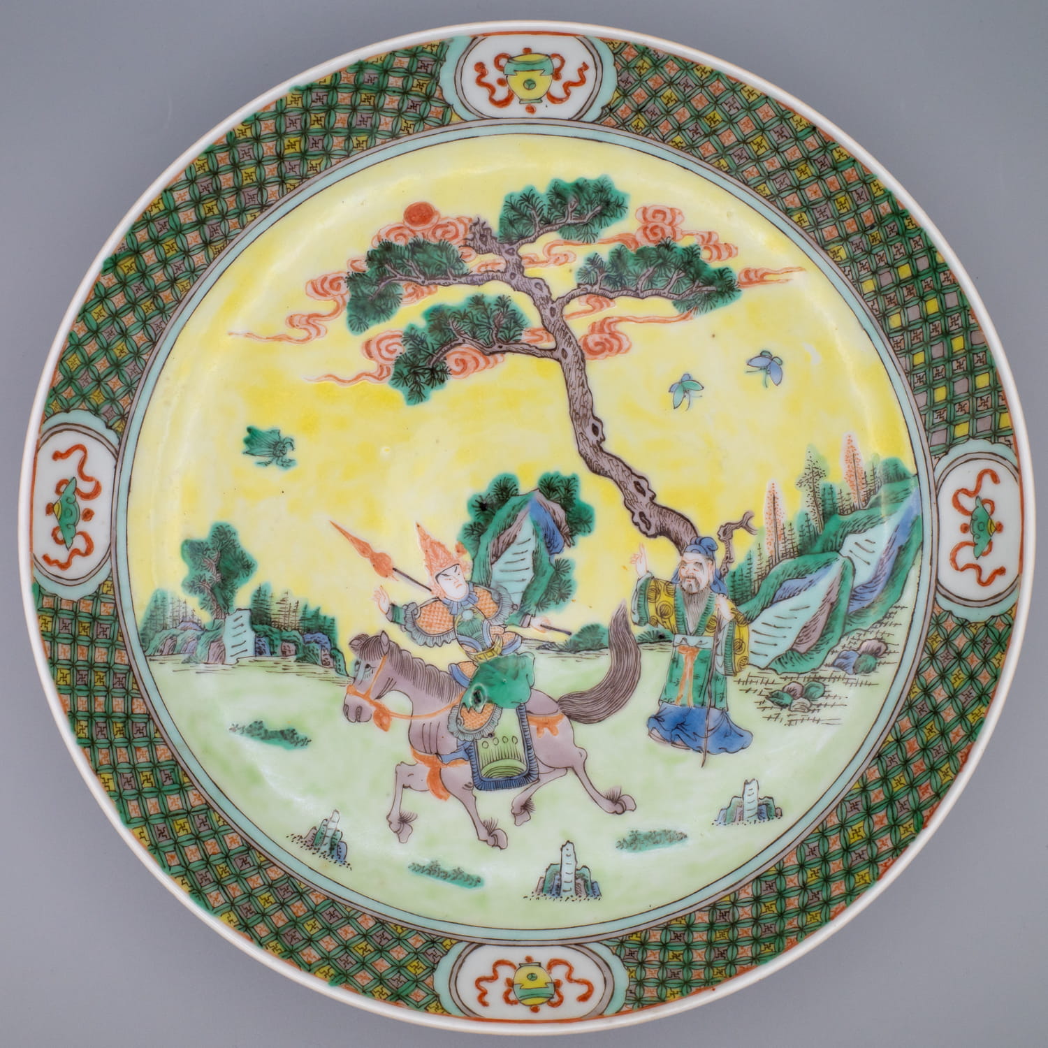 Large Chinese Kangxi style famille jaune decorated shallow bowl featuring a central scene with figures under a large pine tree, framed by a wide diaper border with precious objects. Typical Kangxi style groove foot rim with apocryphal iron red Kangxi mark in the middle but made during the late Qing dynasty or Republic period. Diameter: 28.5 cm.