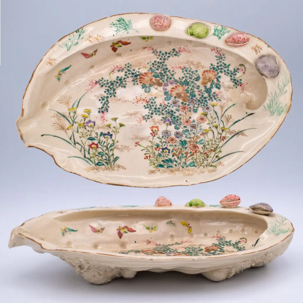 Gorgeous Japanese Kyoto satsuma serving dish in the form of a large abalone shell with additional relief-moulded and applied smaller shells on its surface. Decorated in colourful overglaze enamels with flowers and butterflies. Unsigned but stylistically similar to some examples by the studio Kinkozan.