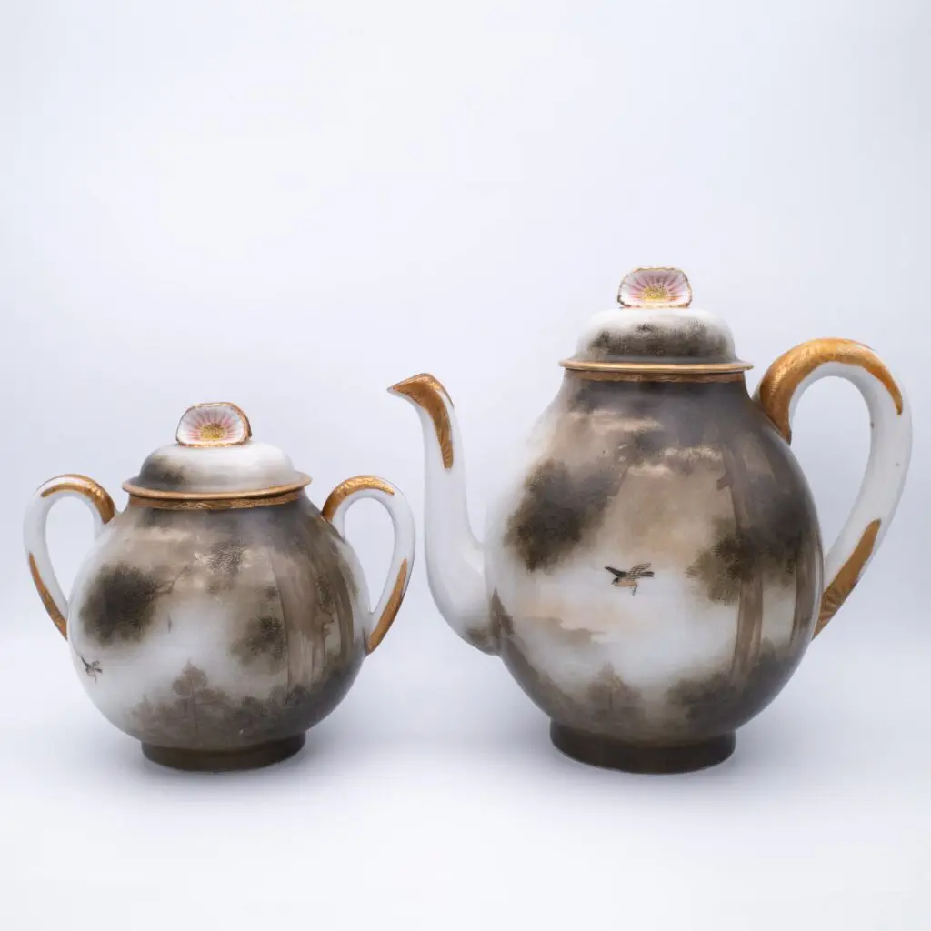 Really finely painted antique Japanese teapot and sugar bowl depicting unusual atmospheric scenes with birds flying in the forest. With flower finials and gold accents on the handles, spout and around the rims. Very rare examples of this type. Each marked to the base with iron red mark.