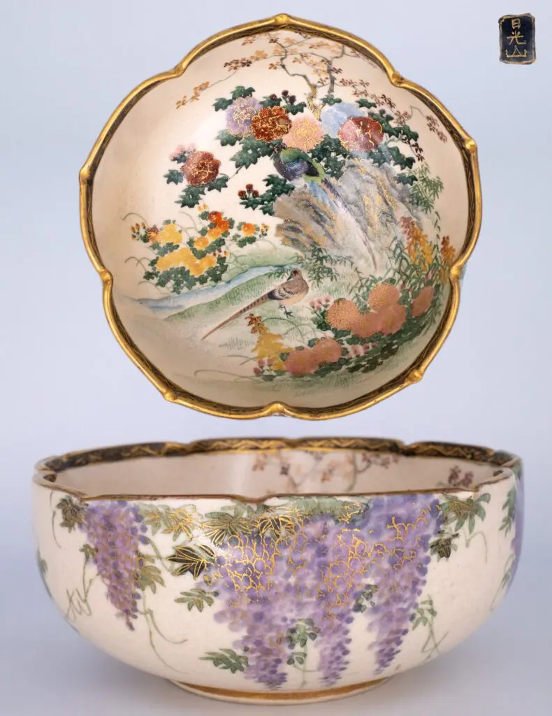 Nicely shaped Satsuma pottery bowl featuring landscape scene with a multitude of flowers and a pair of pheasants, one perched on a rock and other below by the stream. Exterior decorated with wisterias. Marked ‘Nikkozan’ 日光山 underneath.