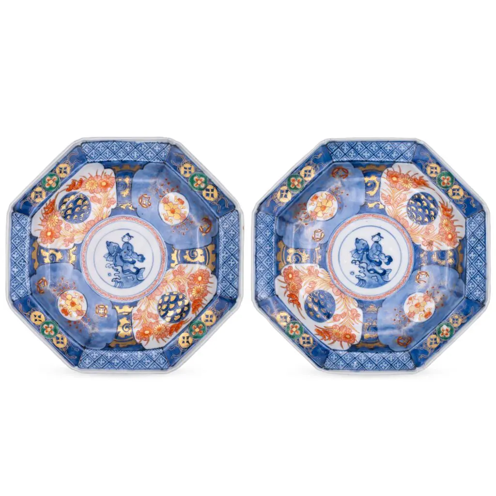 Pair of Antique Japanese Fukagawa Koransha Imari Porcelain Octagonal Plates