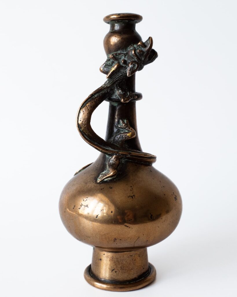 Beautiful antique Chinese late Ming or early Qing dynasty bronze bottle vase with a chilong dragon coiled around the neck. Surface has been at some point polished but it still has a very nice patina to it. Great rare piece for a collector! Height: 15 cm.