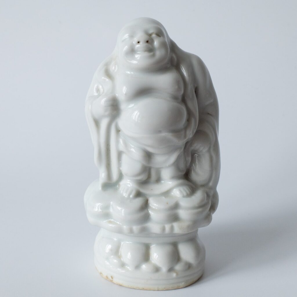 Charming antique Chinese Blanc de Chine Dehua porcelain figure of the ‘Laughing Buddha’ Budai (Pu-Tai), depicted standing on a lotus throne and holding his characteristic bag in his hand. Remnants of the wax export seal on the back. Nice Qing dynasty example for a collection. Height: 10.5 cm.