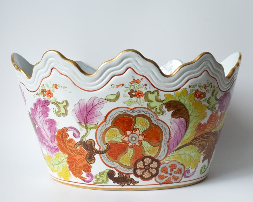 Gorgeous vintage pseudo-tobacco leaf pattern monteith bowl based on antique Chinese export porcelain examples of the same design. Judging by the potting likely a 20th century version produced by Mottahedeh / Vista Alegre in Portugal. Impressed ‘A’ mark to the base. Width: 26 cm