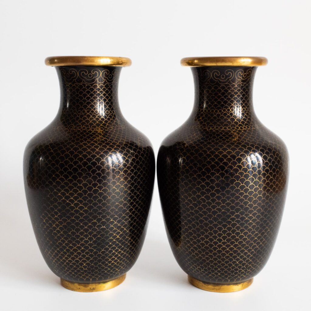 Fine Chinese Antique Republic Black Monochrome Cloisonne Enamelled Vases 20th C