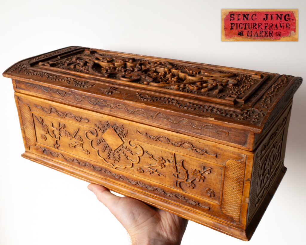 Nice large Chinese Canton export wooden box with typical relief-carved decoration featuring a bat-shaped cartouche with figures on the lid, surrounded by additional bats and various floral and foliate scrolls all around. Original label inside which reads ‘SING JING. PICTURE FRAME MAKER’. Dimensions: 40x19x15.5 cm.