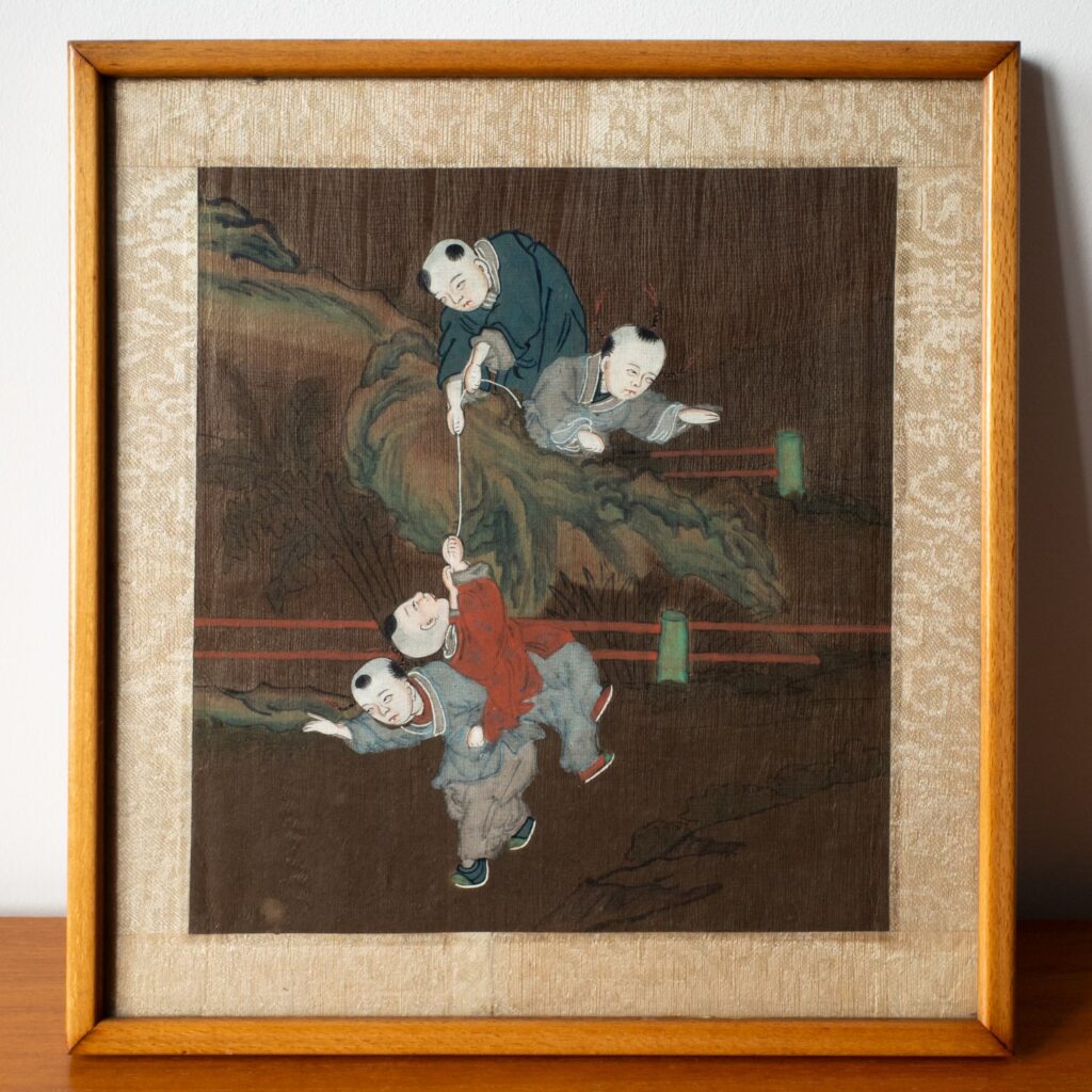 Charming antique Chinese silk painting depicting boys playing in the garden. Nicely mounted and framed. Very attractive decorative piece. Dimensions: frame measures 25×23 cm, artwork measures 19×16.5 cm.